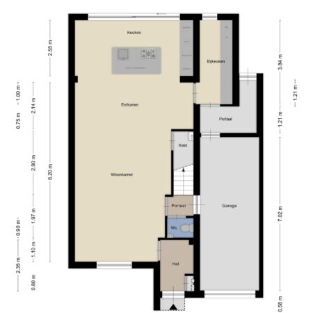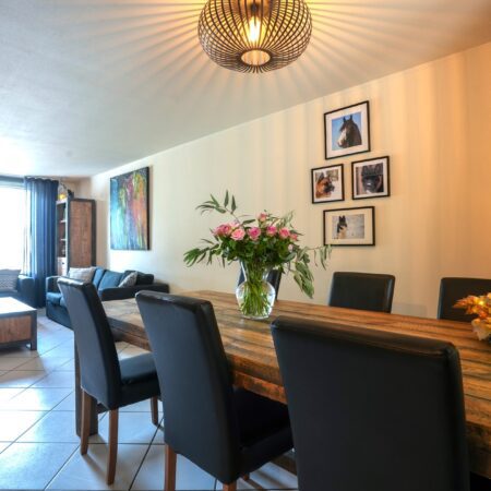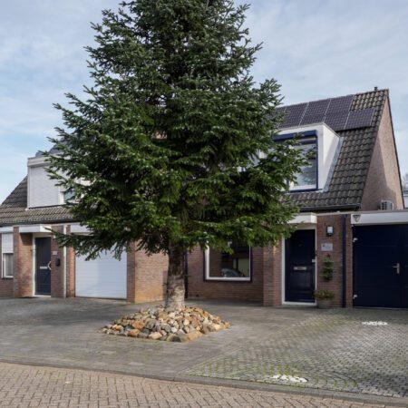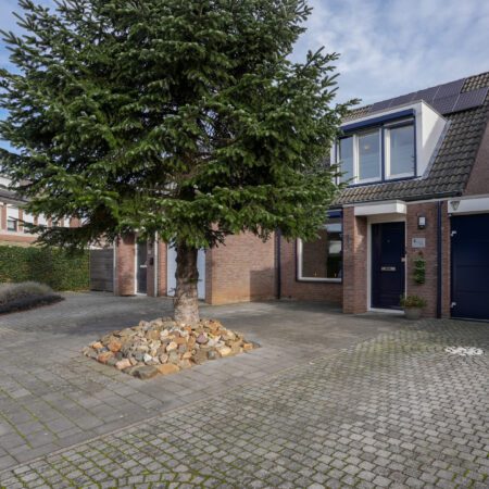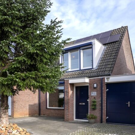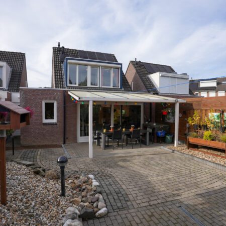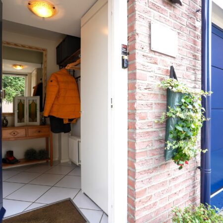 De voortuin van deze woning is grotendeels bestraat zodat je met gemak 2 auto’s kunt parkeren op je eigen terrein. Via de overdekte entree gaan we naar binnen en komen in de hal waar zich een moderne meterkast uit 2023 (met glasvezelaansluiting) bevindt. We lopen door naar de gezellige woonkamer van ca. 37 m2 met witte plavuizen vloer, een MaxiCool design airco uit 2021 en een elektrisch bedienbaar rolluik aan de voorzijde. De woonkamer heeft een room divider naar het gedeelte waar oorspronkelijk de keuken zich bevond, een portaal met toegang naar het gastentoilet, de garage en naar de verdieping alsmede een praktische, ruime bergkast waar de cv-combiketel (Intergas HRE uit 2021, huur) is geplaatst.