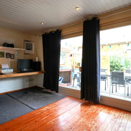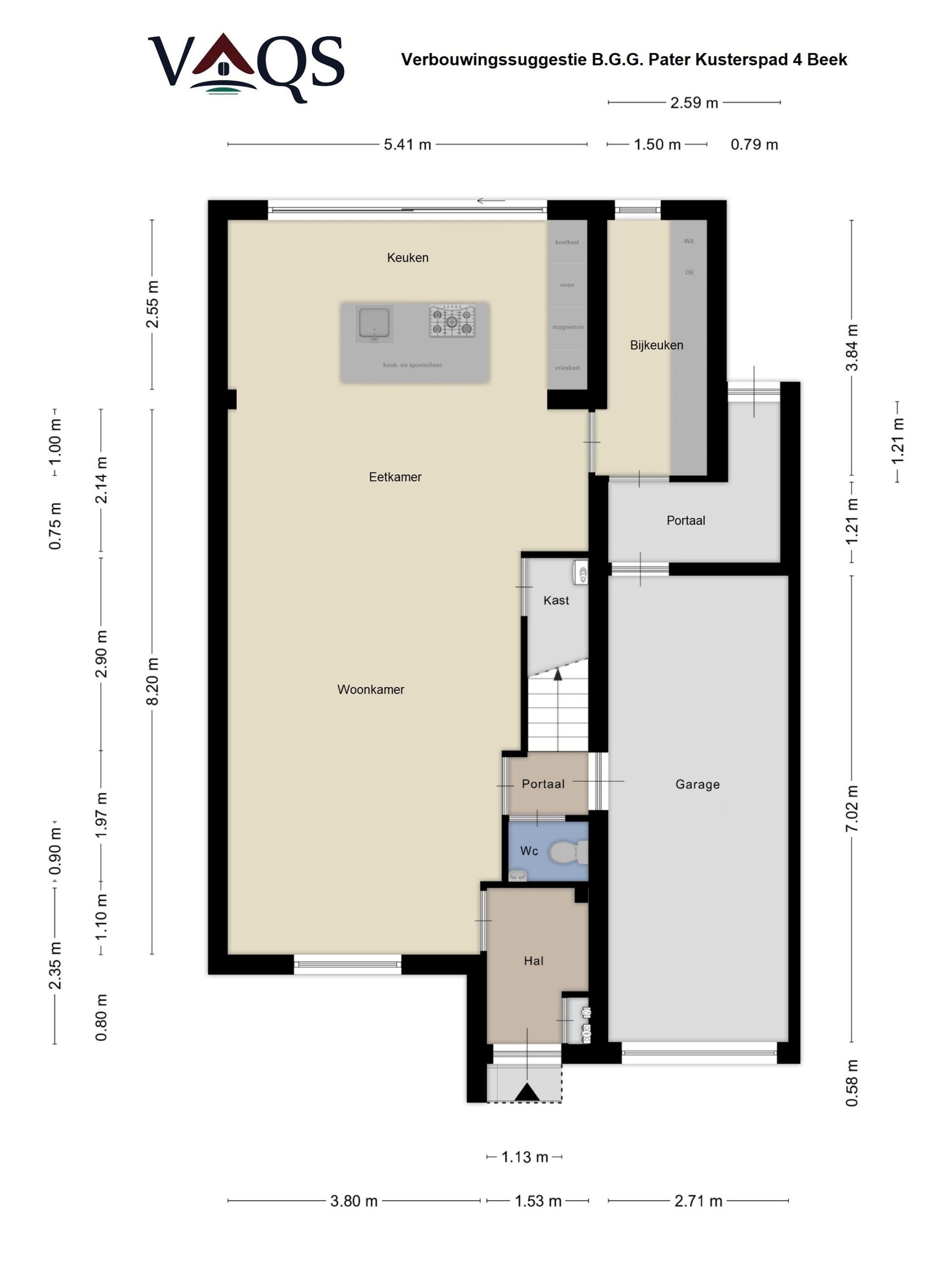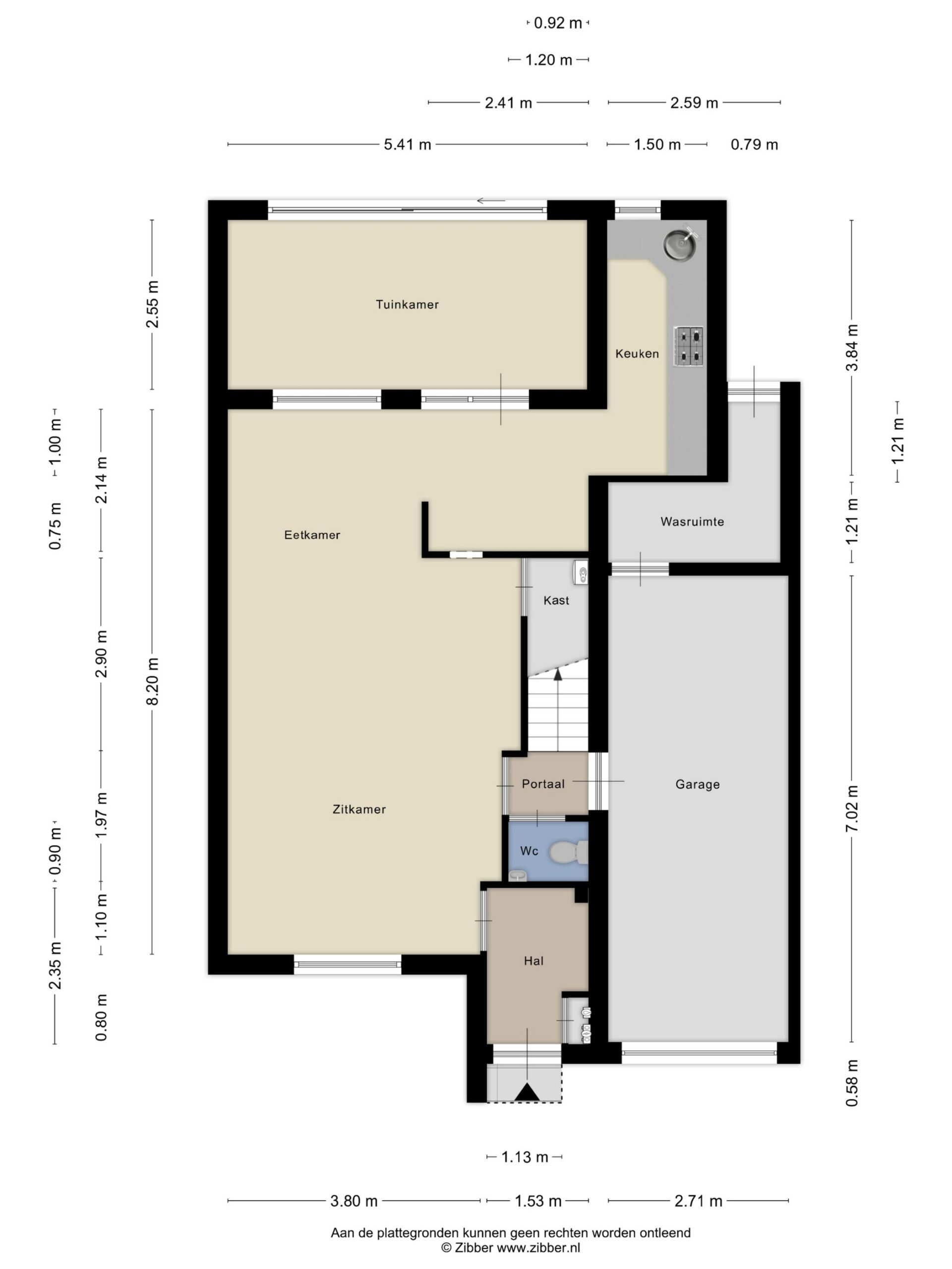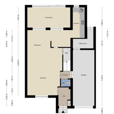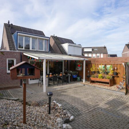 We lopen terug om via de woonkamer naar het portaal te gaan. Hier bevindt zich het deels betegelde gastentoilet met staand closet en fonteintje. Via het portaal kun je ook inpandig naar de ruim bemeten garage van ca. 7.00 x 2.70 m. Deze is voorzien van elektra en water en beschikt bovendien over splinternieuwe Hörmann aluminium garagedeuren. In het verlengde van de garage ga je d.m.v. een loopdeur naar een geïsoleerde wasruimte waar de witgoedaansluitingen zijn geplaatst. Vanuit deze ruimte heb je een praktische toegang naar de achtertuin. Aansluitend aan de tuinkamer is er in ca. 2008 een grote aluminium terrasoverkapping geplaatst in de onderhoudsvriendelijk aangelegde achtertuin gelegen op het oosten. Voor wie de huidige indeling op de begane grond zou willen wijzigen hebben wij bij de plattegronden een verbouwingssuggestie ter inspiratie bijgevoegd.