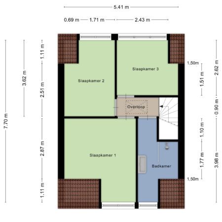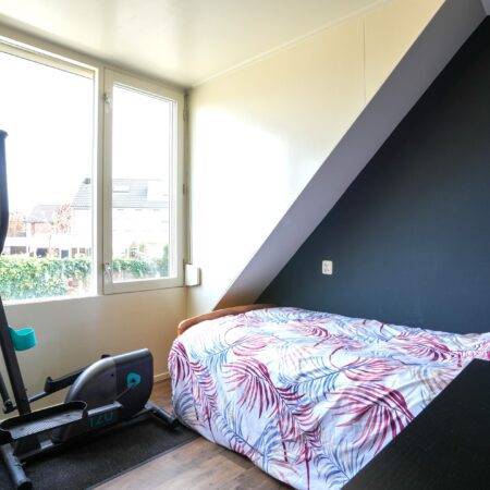 Via een gesloten trap vanuit het portaal gaan we naar boven en komen daar uit op een overloop die toegang geeft tot 3 slaapkamers, de badkamer en door middel van een nieuwe, inklapbare houten vlizotrap toegang naar de bergzolder. De geheel betegelde badkamer van ca. 5.5 m2 is in 2023 volledig vernieuwd en beschikt over een inloopdouche met glazen spatwand, een groot formaat wastafelmeubel, sierradiator, mechanische ventilatie en een dakkapel met rolluik. Zowel de overloop als de 3 slaapkamers zijn voorzien van een nieuwe hout-look pvc-vloer uit 2023. De 3 slaapkamers van respectievelijk ca. 12, 8 en 7 m2 zijn allemaal voorzien van een dakkapel en deels nieuwe rolluiken.