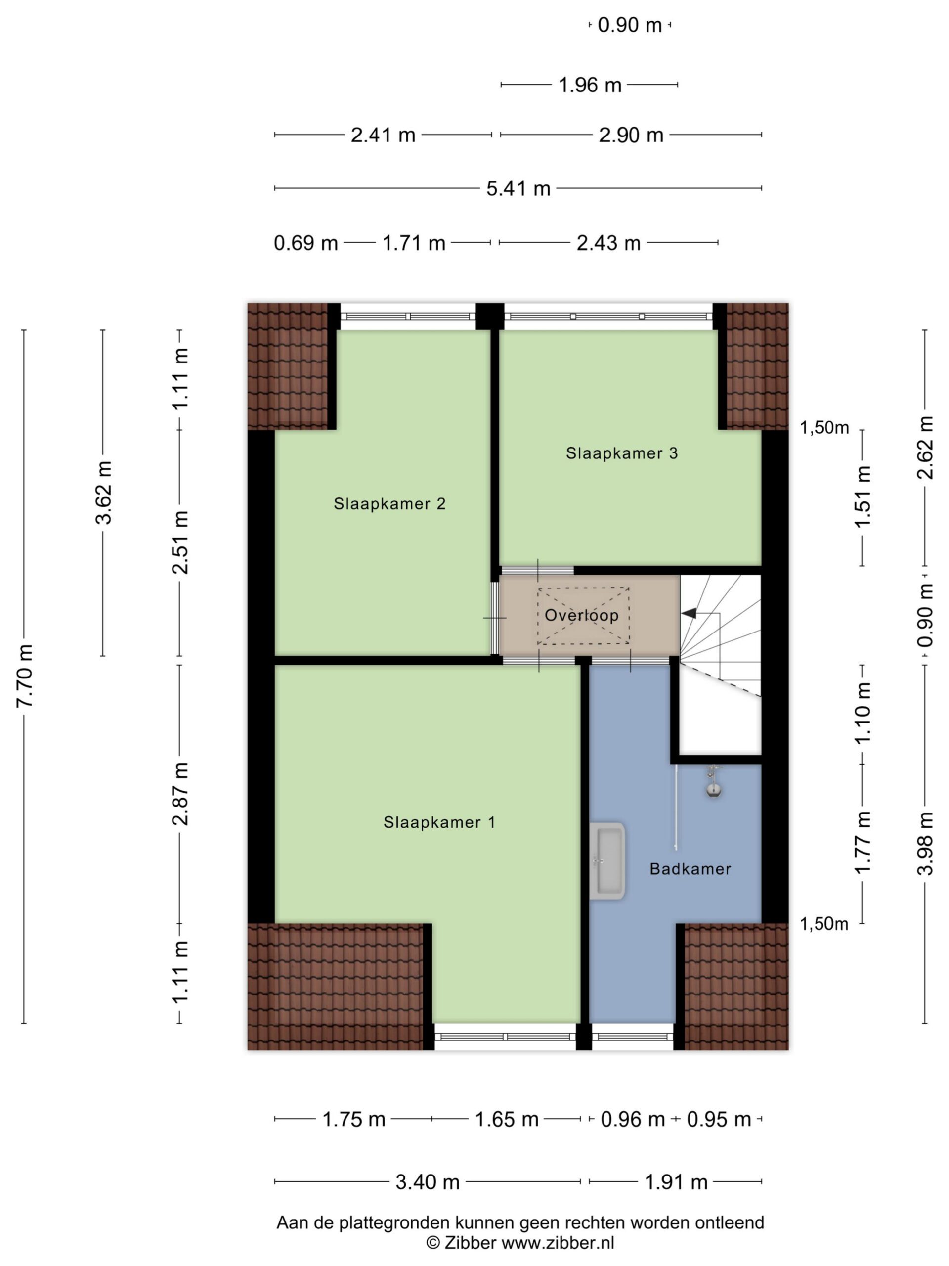 Met een houten vlizotrap komen we op een ruime bergzolder van ca. 5.40 x 3.45 m met een maximale hoogte tot onderkant nokbalk van ca. 1.70 m.