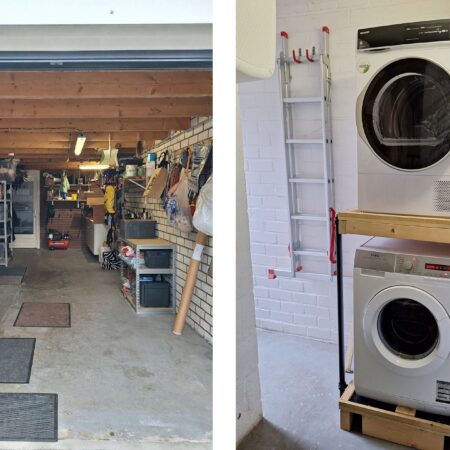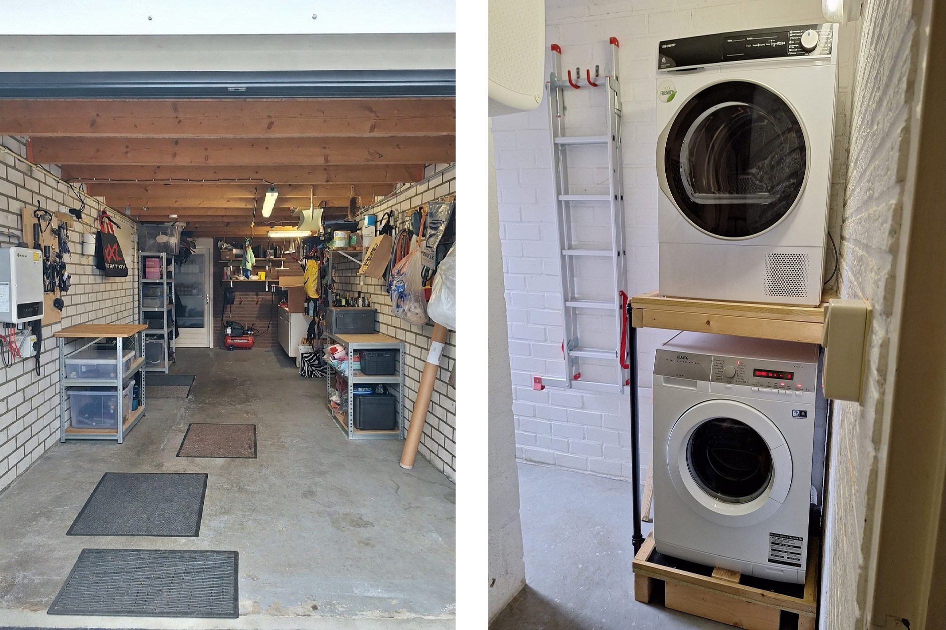 We lopen terug naar de woonkamer om van daaruit naar het portaal te gaan. Hier bevindt zich het deels betegelde gastentoilet met staand closet en fonteintje. Via het portaal kun je ook inpandig naar de ruim bemeten garage van ca. 7.00 x 2.75 m. Deze is voorzien van elektra en water en beschikt bovendien over splinternieuwe, openslaande Hörmann aluminium garagedeuren. In het verlengde van de garage heb je d.m.v. een loopdeur toegang naar een geïsoleerde wasruimte waar de witgoedaansluitingen zich bevinden. Vanuit deze ruimte heb je eveneens toegang naar de achtertuin. Aansluitend aan de tuinkamer is er in ca. 2008 een grote aluminium terrasoverkapping geplaatst in de onderhoudsvriendelijk aangelegde achtertuin. Voor wie inspiratie wenst om de huidige indeling op de begane grond te wijzigen, hebben wij bij de plattegronden een verbouwingssuggestie gevoegd voor de realisatie van een grote open keuken met kookeiland in de bestaande aanbouw.