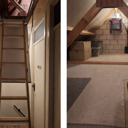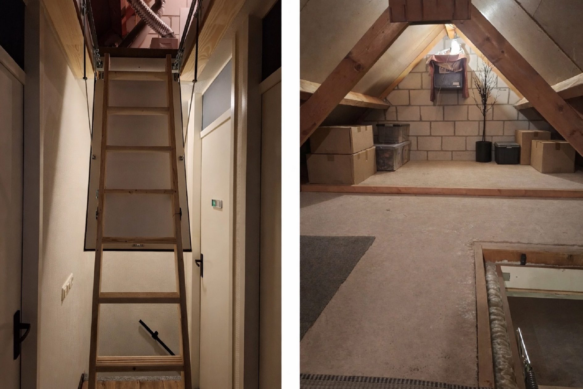 Met een nieuwe houten vlizotrap komen we op een ruime bergzolder van ca. 5.40 x 3.45 m met een maximale hoogte tot onderkant nokbalk van ca. 1.70 m.