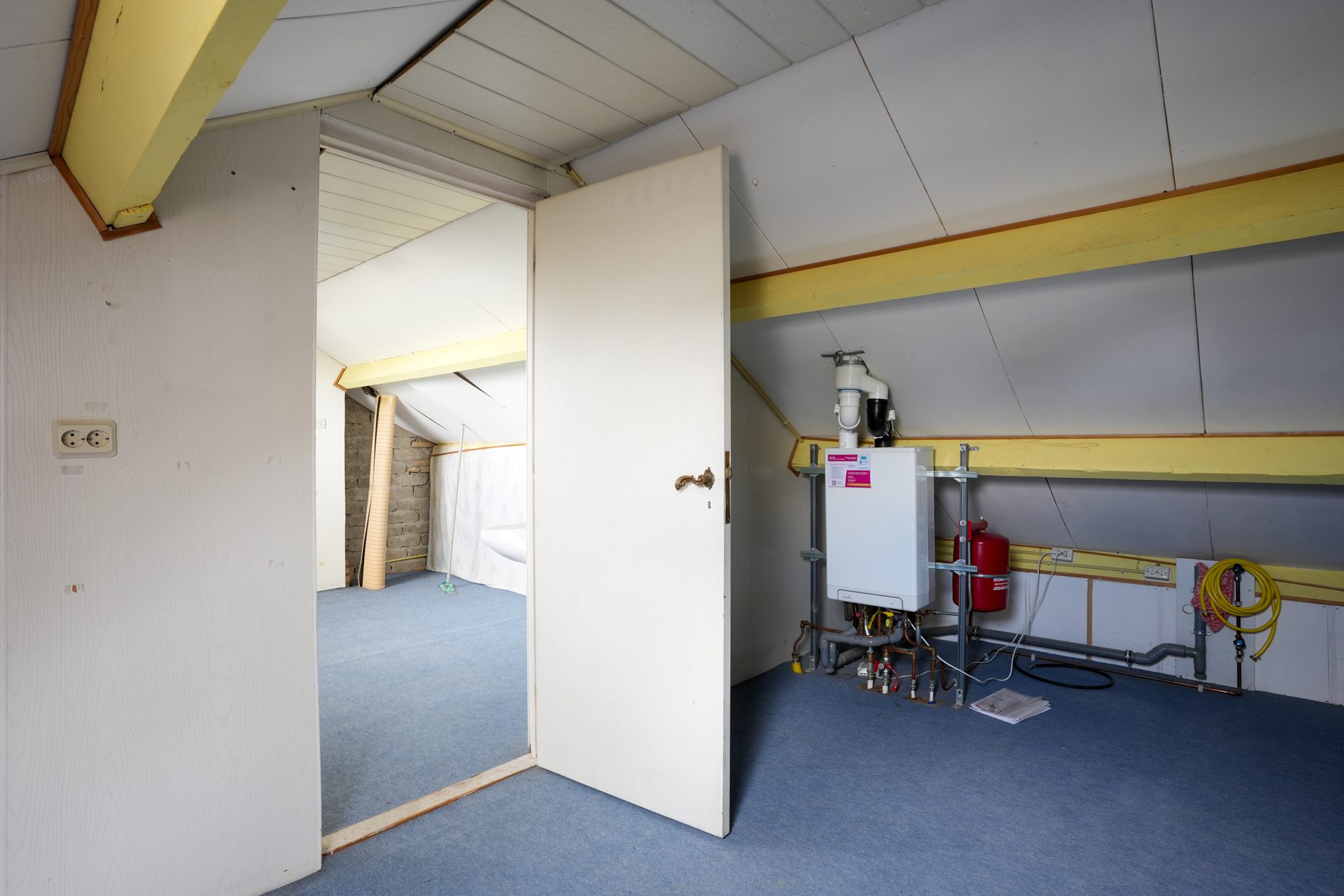 De zolderverdieping is eveneens met een wenteltrap te bereiken. Boven komt u uit op een grote overloop annex bergzolder van ca. 3.50 x 2.90 m (gemeten vanaf 1.50 m plafondhoogte). Deze ruimte is voorzien van een Velux GGL102 dakraam (55 x 78 cm) met dubbele beglazing. Hier is tevens de cv-combiketel geplaatst (Intergas HRC Kombi Kompakt 36/30 CW5, bouwjaar 2023 en gehuurd van Volta NXT (5-jaars huurcontract). Via deze ruimte is er d.m.v. een loopdeur toegang naar de vierde slaapkamer van ca. 3.85 x 2.90 m (gemeten vanaf 1.50 m plafondhoogte). Hier is een vaste wastafel aanwezig met warm en koud stromend water, alsmede een Velux GGL808 dakraam (134 x 140 cm) met dubbele beglazing. Door middel van het plaatsen van een dakkapel is de effectieve ruimte in deze slaapkamer eenvoudig fors te vergroten.
