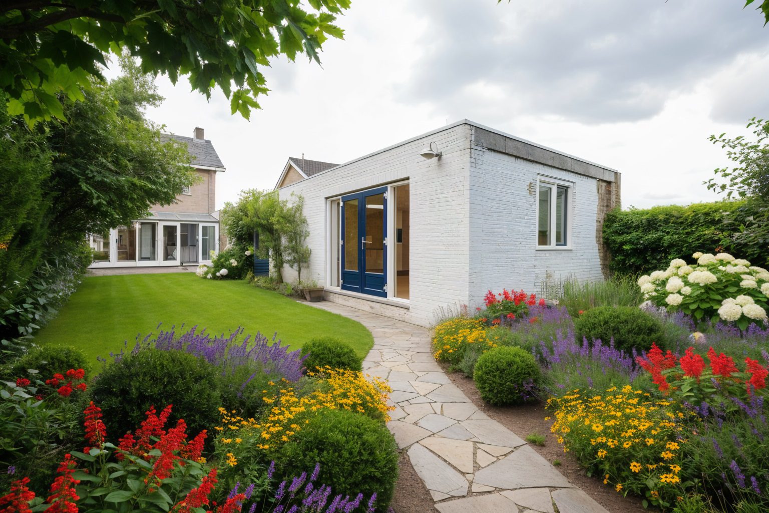 Aansluitend aan de tuinkamer bevindt zich een groot buitenterras met een optimale privacy en aangrenzend een achtertuin van ca. 23 m diep (gemeten vanaf de achtergevel). Via het terras kunnen we d.m.v. een loopdeur in de zijgevel van de garage daar naar binnen. De halfsteens gemetselde en ruim bemeten garage van ca. 6.30 x 4.05/3.65 m beschikt over elektra, water, verwarming en een smeerput! In het verlengde van de garage is eind 2005 een kantoorruimte gerealiseerd (totaal oppervlak begane grond ca. 45 m2) met een eigen ingang, hal, toilet annex doucheruimte en het kantoor met veel raampartijen, 2 lichtkoepels, verwarming en een pantry met spoelbak, keramische kookplaat, rvs-afzuigkap, oven en koelkast. Deze ruimte beschikt over een separate tussengroep voor elektra met 6 schakelautomaten. De kantoorruimte kan natuurlijk ook prima ingericht worden als praktijkruimte, atelier, guesthouse of mantelzorgwoning.