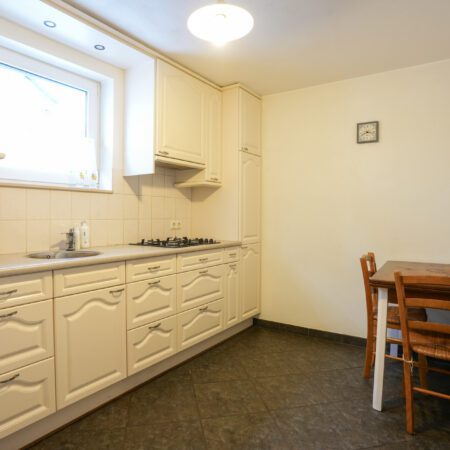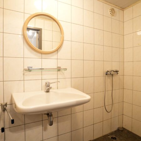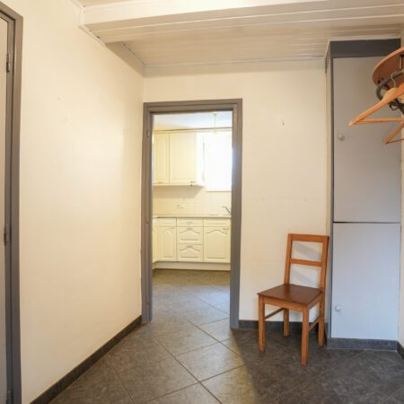Via een met een hek afsluitbare, ruime oprit van ca. 12.00 x 5.00 m kom je bij de entree in de zijgevel van deze woonboerderij. We gaan naar binnen. In de hal van ca. 3.20 x 2.20 m bevindt zich een eenvoudige meterkast (elektra- en gasmeter) met 7 groepen (smeltzekeringen) en 2 aardlekschakelaars. Vanuit de hal is het gastentoilet, een kleine badkamer, de gesloten keuken en de woonkamer bereikbaar. Het toilet is geheel betegeld en voorzien van een staand closet. De eveneens geheel betegelde badkamer van ca. 2.10 x 1.20 m beschikt over een wastafel en een douche. De gesloten keuken van ca. 3.50 x 2.60 m is, net als de hal voorzien van een tegelvloer. In de keuken is een inbouwkeuken in hoekopstelling geplaatst met spoelbak, gaskookplaat, afzuigkap, oven-/magnetroncombinatie en koelkast. We lopen weer naar de hal om van daaruit naar de woonkamer te gaan. Deze ruimte van in totaal ca. 7.60 x 5.90 m is verdeeld in een achterkamer met open trap naar de verdieping alsmede een schouw met rookkanaal en een voorkamer. Beiden voorzien van een laminaat vloerbedekking op een betonnen vloerconstructie. In de voorkamer is de hoofdaansluiting voor de tv-kabel en glasvezelinternet geplaatst.
