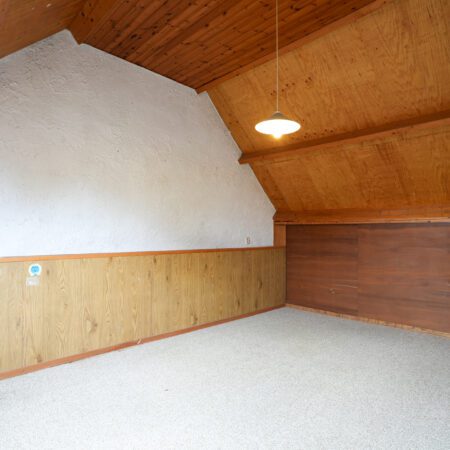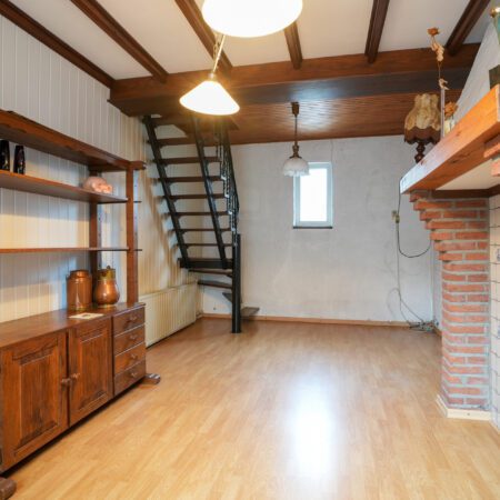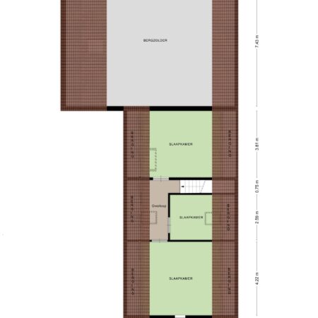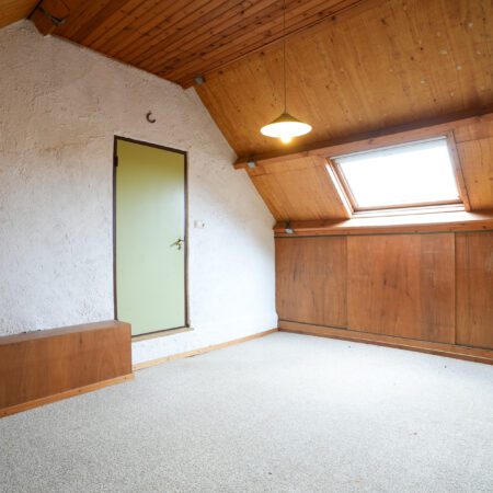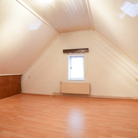 Door middel van een open trap vanuit de achterkamer kunnen we naar boven naar de woonverdieping. Je komt uit op de overloop met een Velux dakraam. Van hieruit zijn de slaapkamers bereikbaar. De slaapkamer 1 van in totaal ca. 4.80 x 4.20 m ligt aan de voorzijde van de woning en beschikt over een vast gevelraam, verwarming en aan weerszijden bergruimte van elk ca. 4.20 x 0.70 m met schuifpanelen. Slaapkamer 2 van ca. 3.00 x 2.60 m bevindt zich aan de rechter zijgevel en is voorzien van een Velux dakraam en bergruimte van ca. 2.60 x 0.70 m met schuifpanelen. Slaapkamer 3 van ca. 4.80 x 3.80 m ligt aan de achterzijde van het woongedeelte en beschikt over een extra groot Velux dakraam, verwarming en aan beide zijden bergruimte van elk ca. 3.80 x 0.70 m met schuifpanelen.