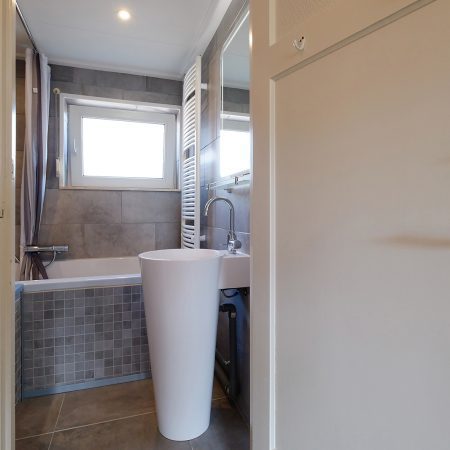 Vanuit de hal kom je via de gesloten trap uit op de overloop van waaruit de 3 slaapkamers en de badkamer zijn te bereiken. De eerste slaapkamer van ca. 3.77 x 2.97 m is gelegen aan de voorzijde van de woning. De tweede slaapkamer van ca. 3.55 x 3.77/3.04 m is gelegen aan de achterzijde van de woning. De derde slaapkamer van ca. 2.90 x 2.52 m is eveneens gelegen aan de achterzijde en voorzien van een vaste grenen kastenwand. De splinternieuwe badkamer van ca. 2.17 x 1.90/1.20 m is geheel betegeld en voorzien van een modern wastafelmeubel, een douche/ligbadcombinatie en een handdoekradiator. Alle kamers op de verdieping beschikken over kunststof kozijnen met dubbele beglazing en rolluiken. Bovendien zijn overal de leidingen ingefreesd en de kamers voorzien van nieuwe stoffen vloerbedekking, nieuw behang en nieuwe gipsplaten plafondafwerking.