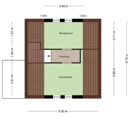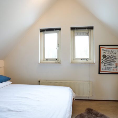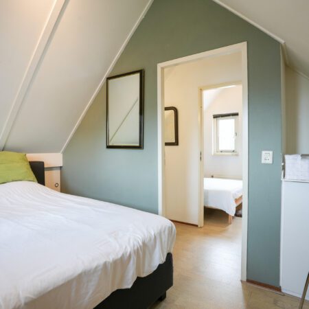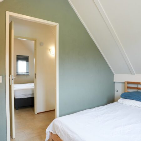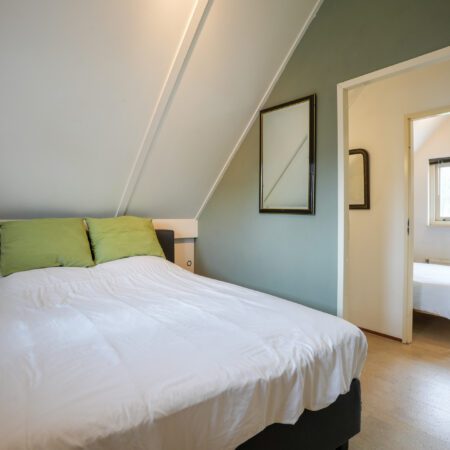 Via een open trap vanuit de living loop je naar boven en kom je uit op een overloop van waaruit 2 slaapkamers bereikbaar zijn van respectievelijk ca. 16 en 12 m2. Beide zijn voorzien van bergruimtes met schuifpanelen.