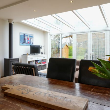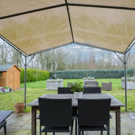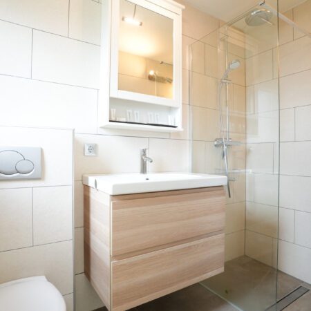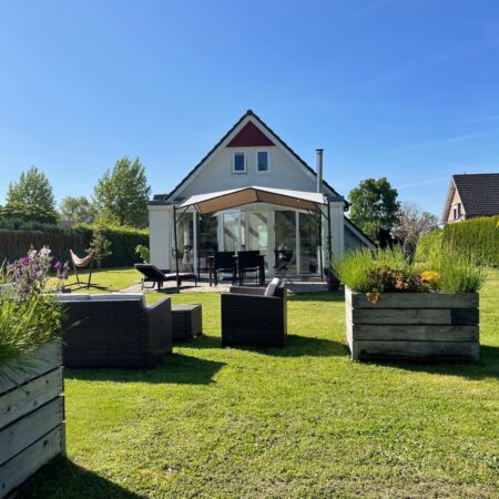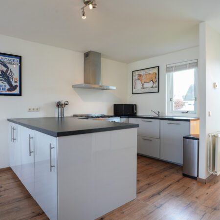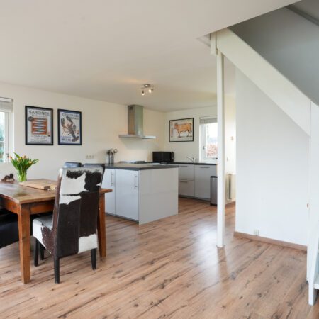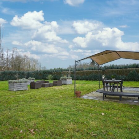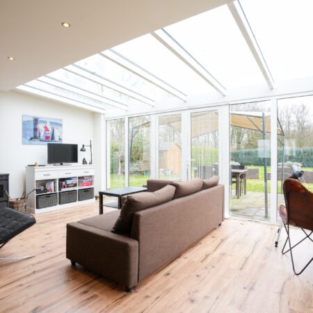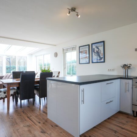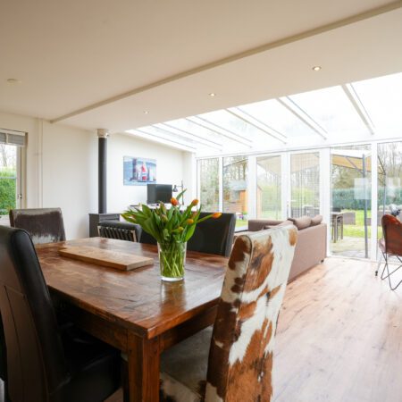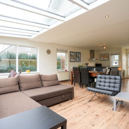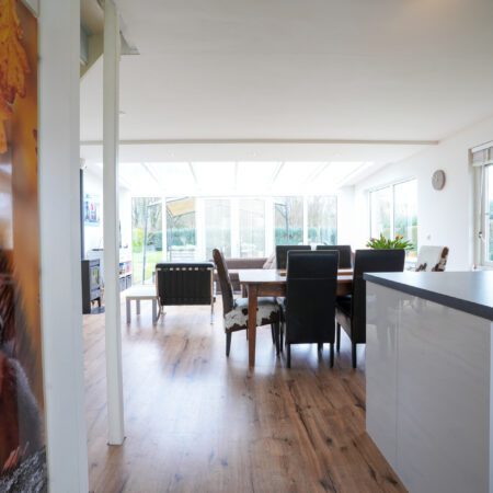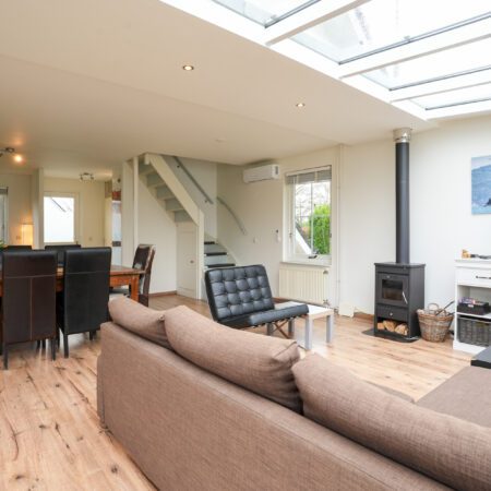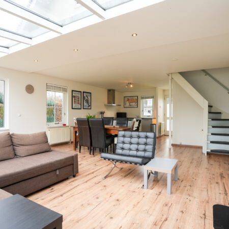 Je komt deze woning binnen via de entree aan de voorzijde. Er is bij de verbouwing bewust gekozen voor een open leefruimte door een paar muren weg te halen. Hierdoor is er een fantastische leefruimte gerealiseerd van maar liefst ca. 47 m2 met een open keuken en een doordacht ontworpen open hal. In de hal bevindt zich een moderne meterkast en de toegang naar een recent genoveerde, geheel betegelde badkamer van ca. 2.50 x 1.40 m, voorzien van een wastafelmeubel, wandcloset, een inloop(regen)douche en een handdoekradiator. De gehele begane grond is (m.u.v. de badkamer) voorzien van een eiken laminaatvloer en glad stucwerk wand- en plafondafwerking. De heerlijke living met mega veel lichtinval beschikt over een glazen pui met openslaande tuindeuren in de achtergevel en deels over een dak dat volledig bedekt is met glazen panelen. Daarnaast een gezellige houtkachel voor als het weer een beetje tegenzit en een nieuwe airco-installatie voor als het weer een beetje te veel meezit. De elektriciteit hiervoor wordt geleverd door 10 zonnepanelen (eigendom). In de open keuken is een moderne, luxe inbouwkeuken in U-opstelling geplaatst. Met lekker veel werkblad! Naast een fraai rvs-kooktoestel met 6 gaspitten en rvs-afzuigkap is er een koelkast en een vaatwasser ingebouwd. We lopen naar buiten via de openslaande tuindeuren in de living naar de geïsoleerde berging c.q. wasruimte van ca. 2.50 x 1.50 m aan de zijkant van de woning. Deze ruimte is verwarmd, voorzien van witgoedaansluitingen en hier is de cv-combiketel geplaatst (Nefit Proline HRC 24-CW3, bouwjaar 2008, eigendom). Buiten begint de enorme achtertuin met een groot betegeld terras. Door het grote perceel dat volledig met groen is omheind, is de buitenbeleving geweldig en een optimale privacy gegarandeerd.