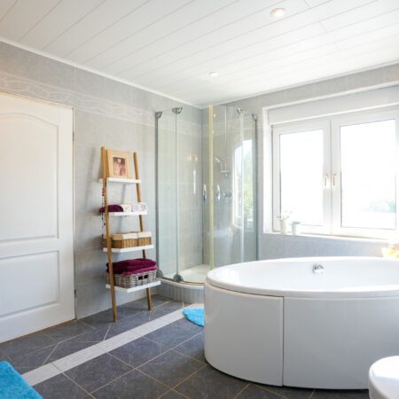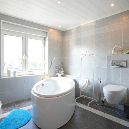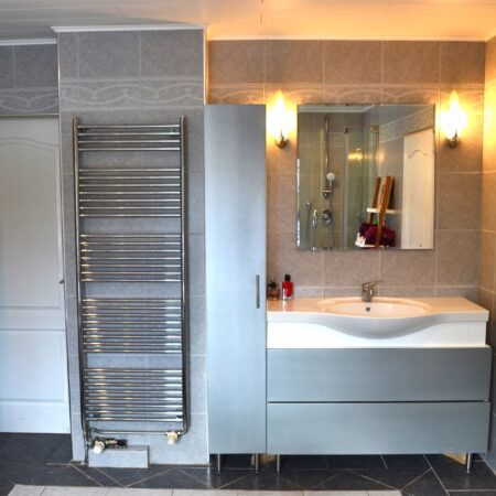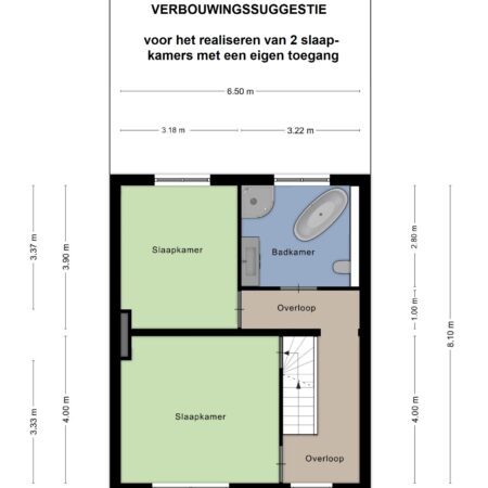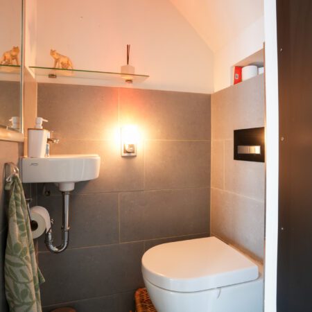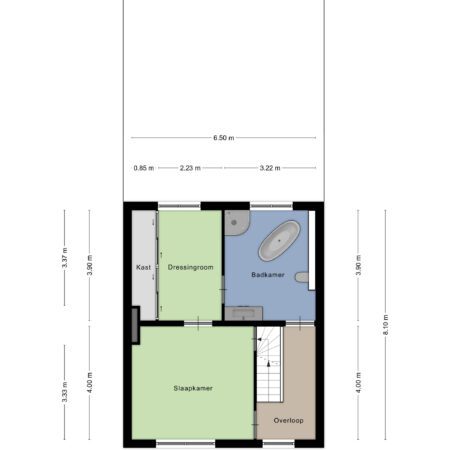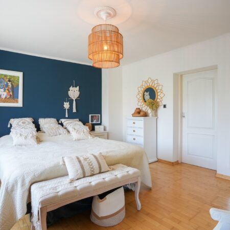 Via de gesloten trap in de hal lopen we naar boven en komen uit op een royale overloop, die, evenals de slaapkamers, is voorzien van beukenhouten stroken laminaat. De constructie van de verdiepingsvloer bestaat uit een houten balkenlaag. De plafondhoogte bedraagt ca. 2.50 m. We gaan verder en lopen de aan de voorzijde gelegen slaapkamer van ca. 4.30 x 4.00 m binnen. Modern afgewerkt met glad stucwerk en alles in kleur en materiaalgebruik sfeervol op elkaar afgestemd! Vanuit deze slaapkamer loop je de volgende slaapkamer van ca. 3.90 x 3.20 m binnen. Deze kamer is ingericht als praktische dressingroom met een vaste kastenwand uit 2021. Zowel vanuit de overloop als vanuit de slaapkamer annex dressingroom heb je toegang tot de royaal bemeten, geheel betegelde badkamer uit 2004 van ca. 3.90 x 3.20 m. De badkamer is voorzien van vloerverwarming, een wastafelmeubel, ligbad, douchecabine, groot vrijstaand ligbad, wandcloset en handdoekradiator.