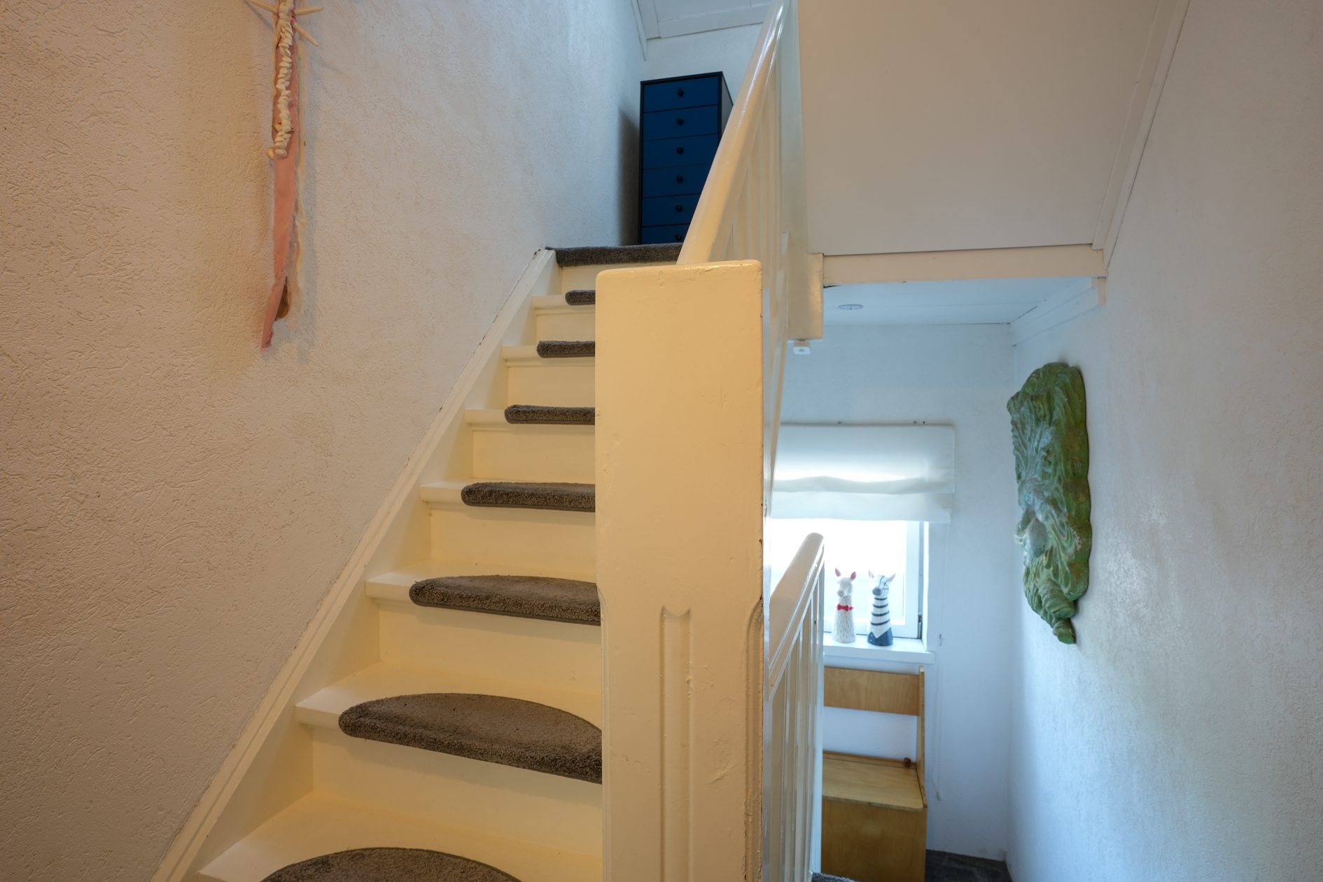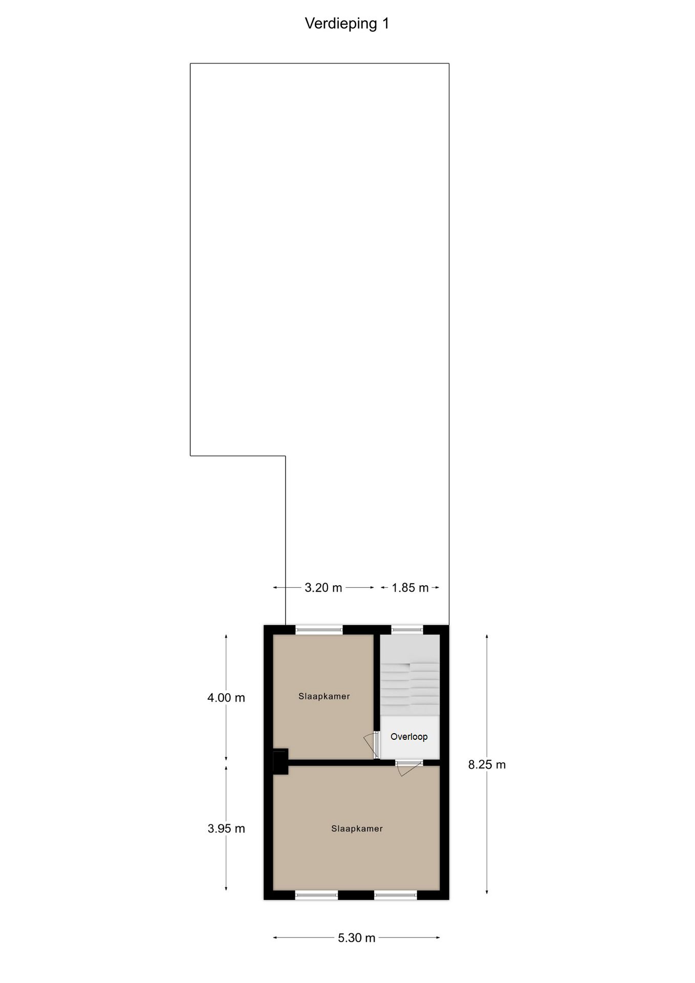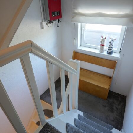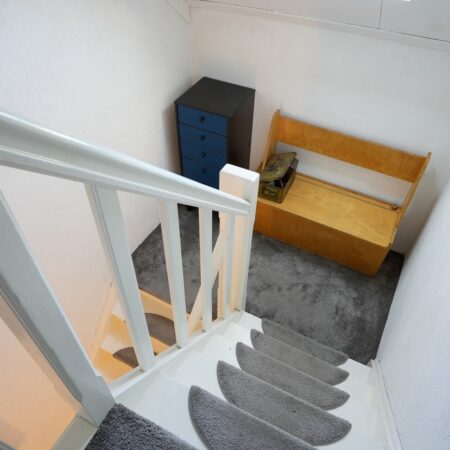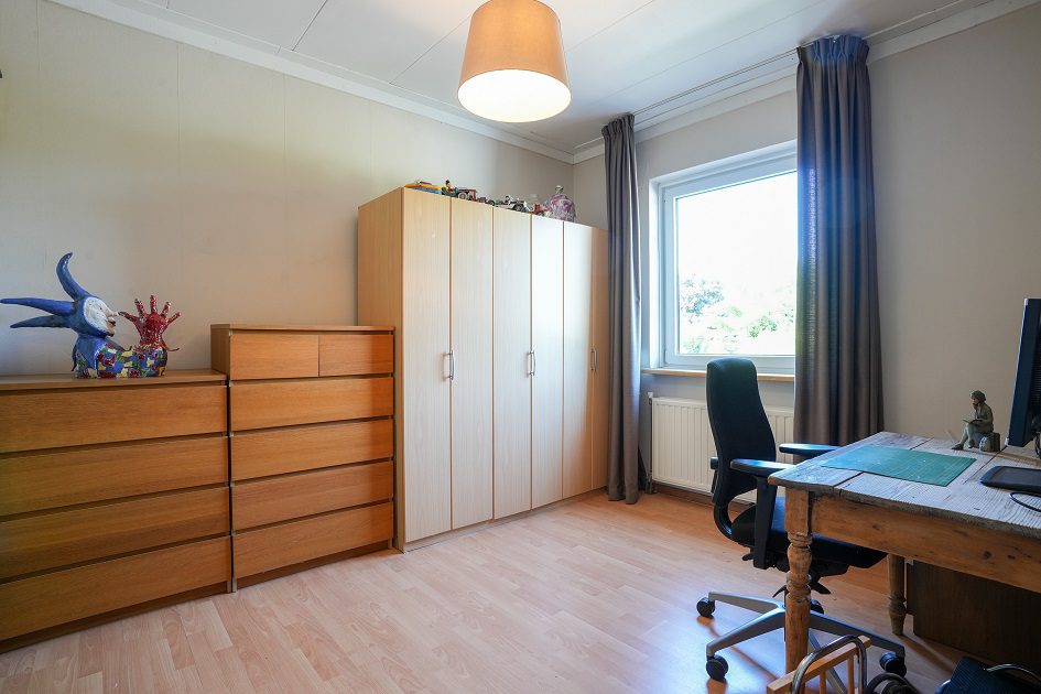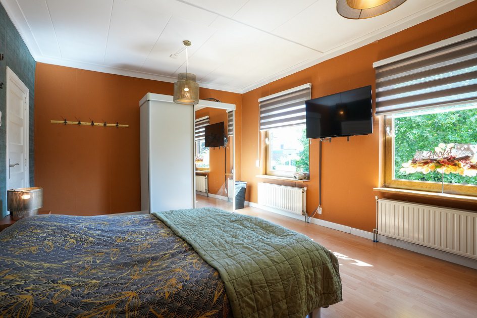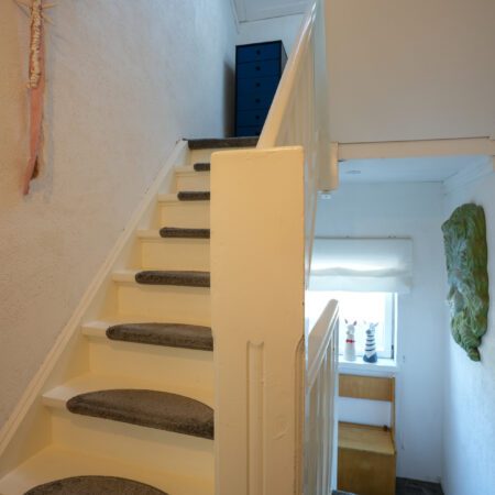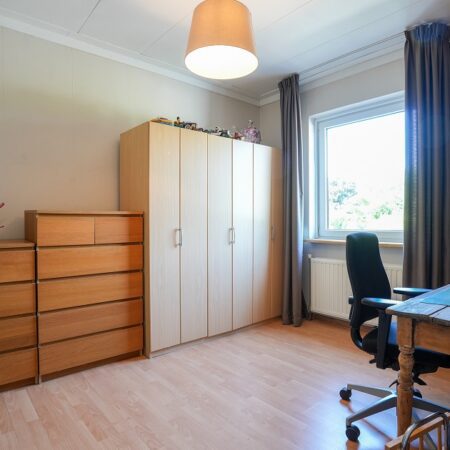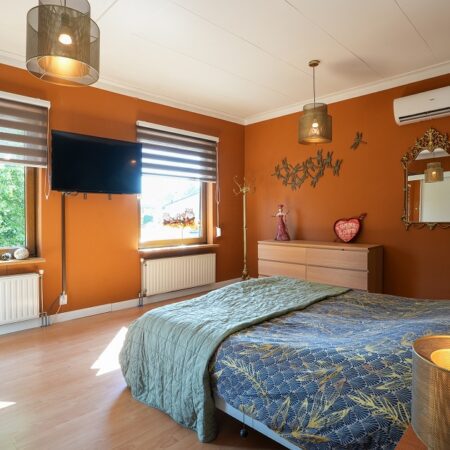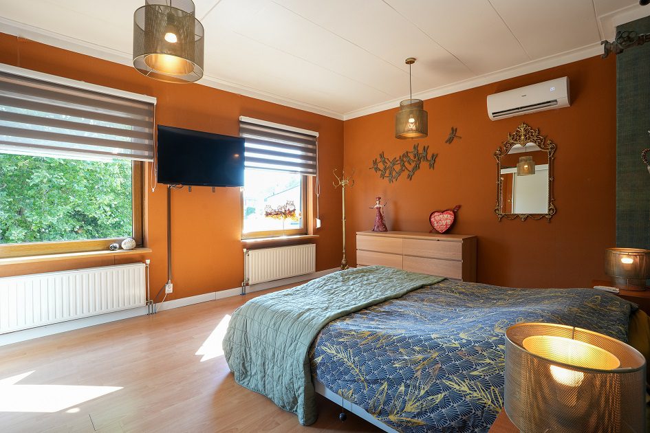 Via de fraaie bordestrap in de ontvangsthal gaan we naar boven en komen uit op de overloop die toegang geeft tot 2 slaapkamers. Wat ook hier weer opvalt, is de enorme plafondhoogte van maar liefst ca. 2.75 m! De eerste, riante slaapkamer van ca. 5.30 x 3.95 m ligt aan de voorzijde van de woning en is voorzien van een airco installatie uit 2022. De tweede slaapkamer van ca. 4.00 x 3.20 m bevindt zich aan de achterzijde van de woning. Beide slaapkamers zijn voorzien van kunststof kozijnen met dubbele beglazing en rolluiken.