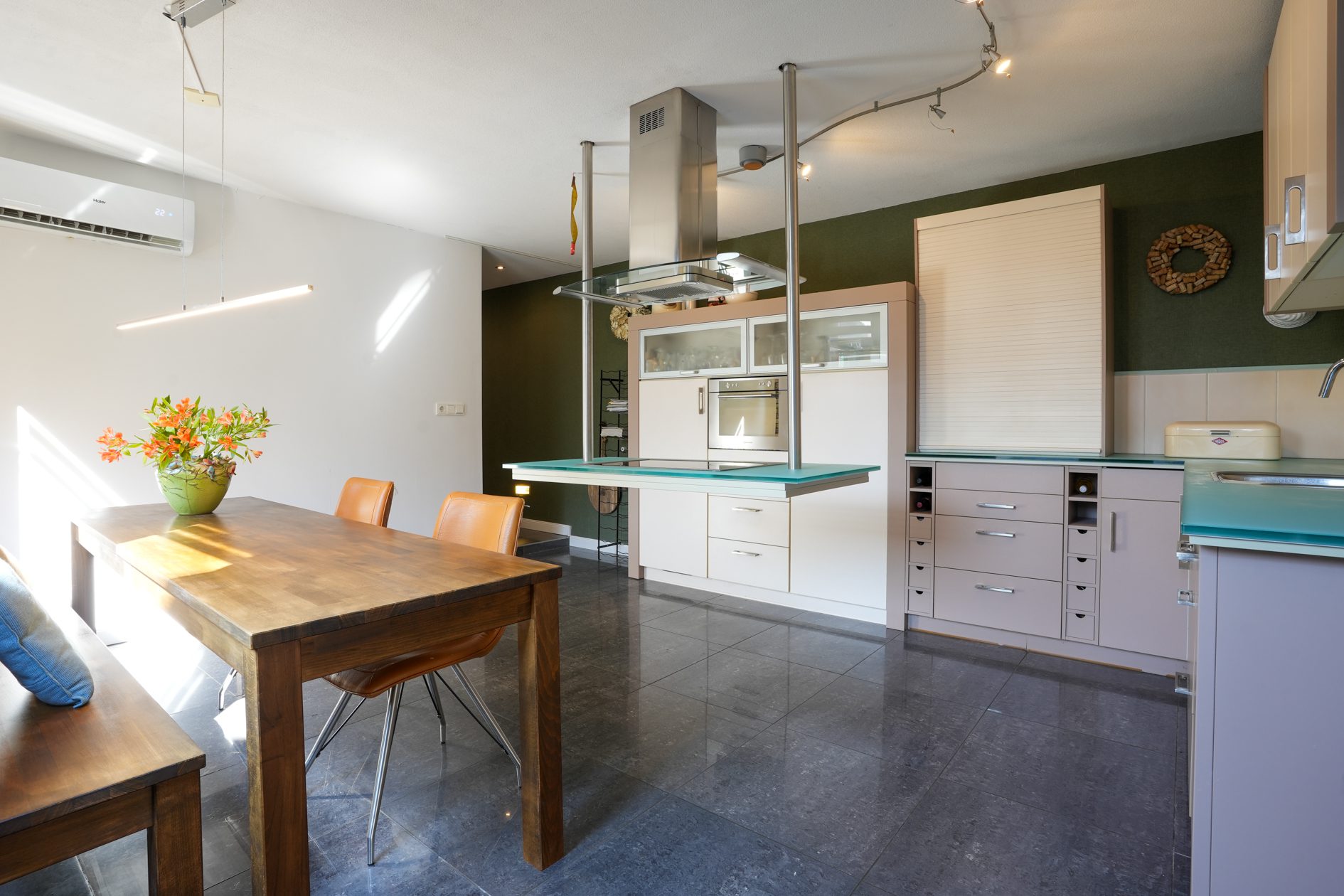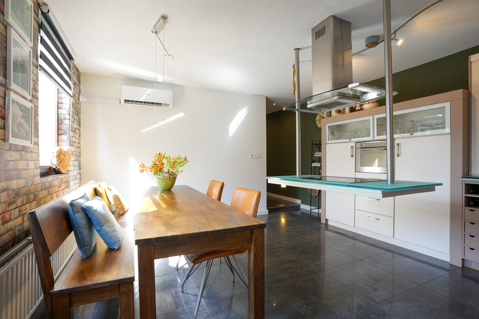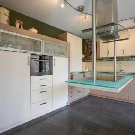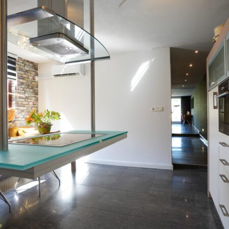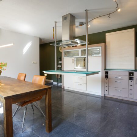 We lopen de woonkamer in. Door 2 extra ramen in de zijgevel te plaatsen is er een aangenaam lichte woonkamer ontstaan met een oppervlakte van ca. 30 m2. Met een moderne houtkachel met schouw en dezelfde moderne afwerking als in de hal is dit een heerlijke ruimte om de dag of avond door te brengen. Vanuit de woonkamer lopen we via een halfopen doorgang naar de gezellige woonkeuken van ca. 4.85 x 4.55 m, voorzien van een airco-installatie uit 2022. Dit is de eerste ruimte in de enorme aanbouw achter de oorspronkelijke hoofdbouw. Hier is in 2006 een unieke, luxe maatwerk inbouwkeuken geplaatst met een zwevend kookeiland, een hardglazen werkblad en voorzien van de gebruikelijke inbouwapparatuur (keramische kookplaat, oven, koelkast en vaatwasser).