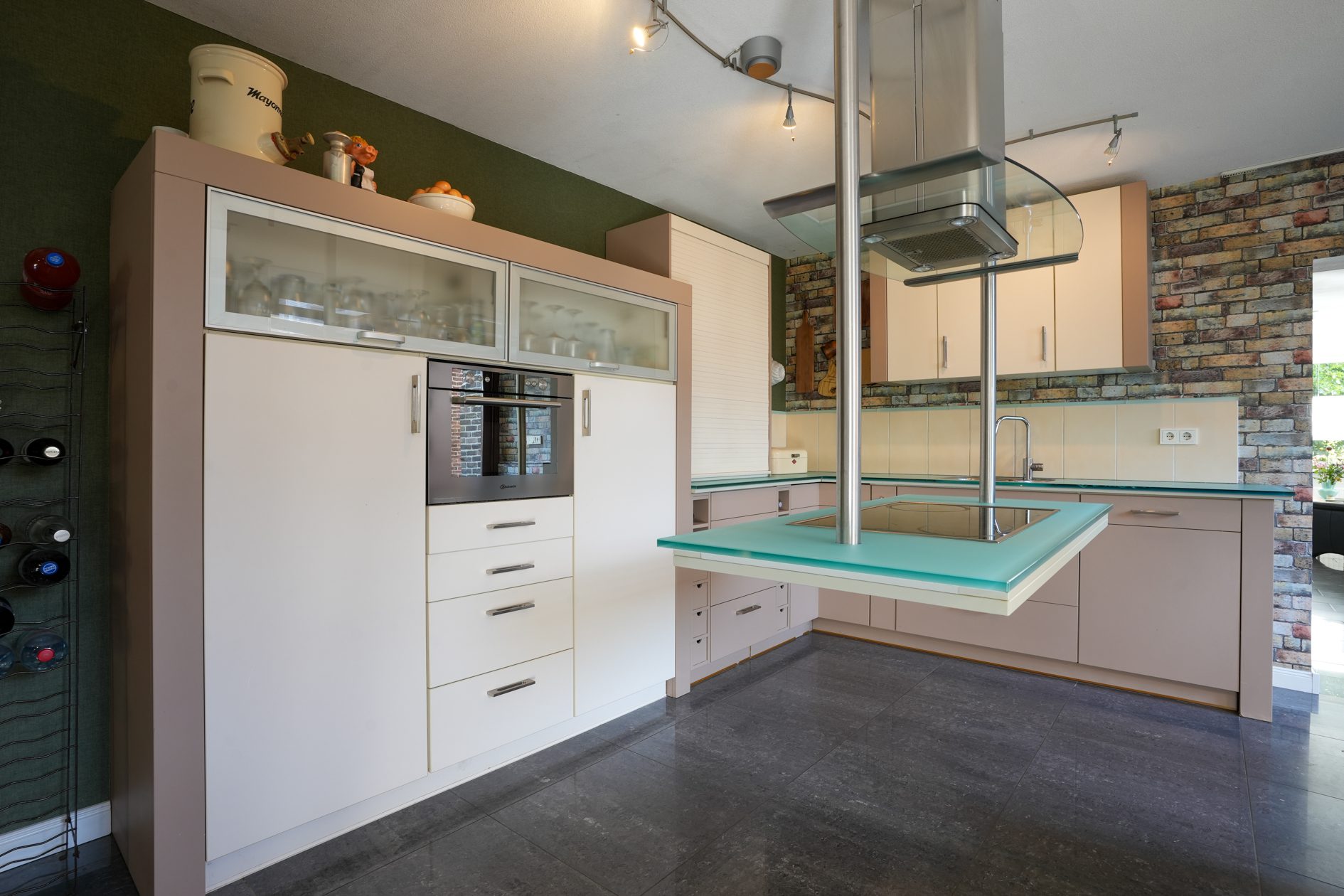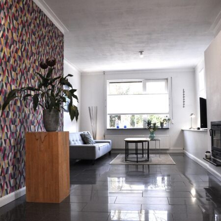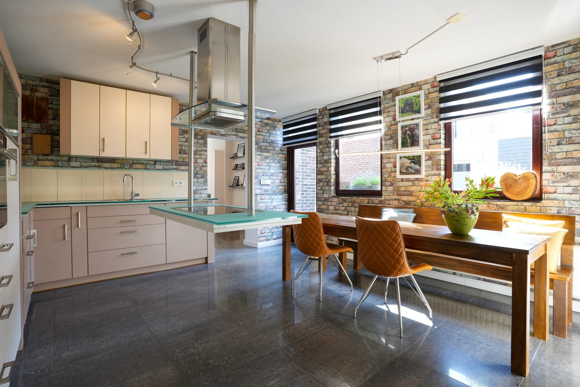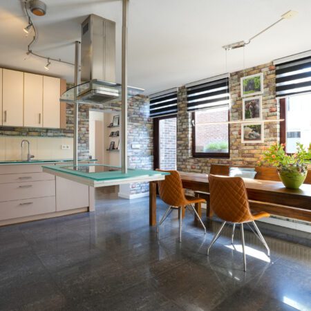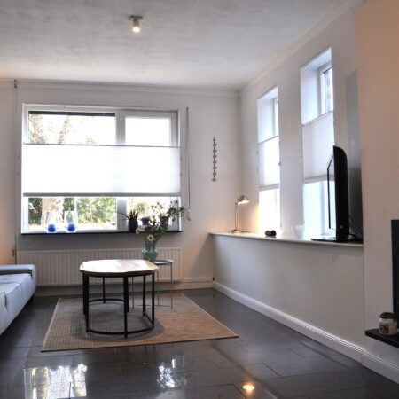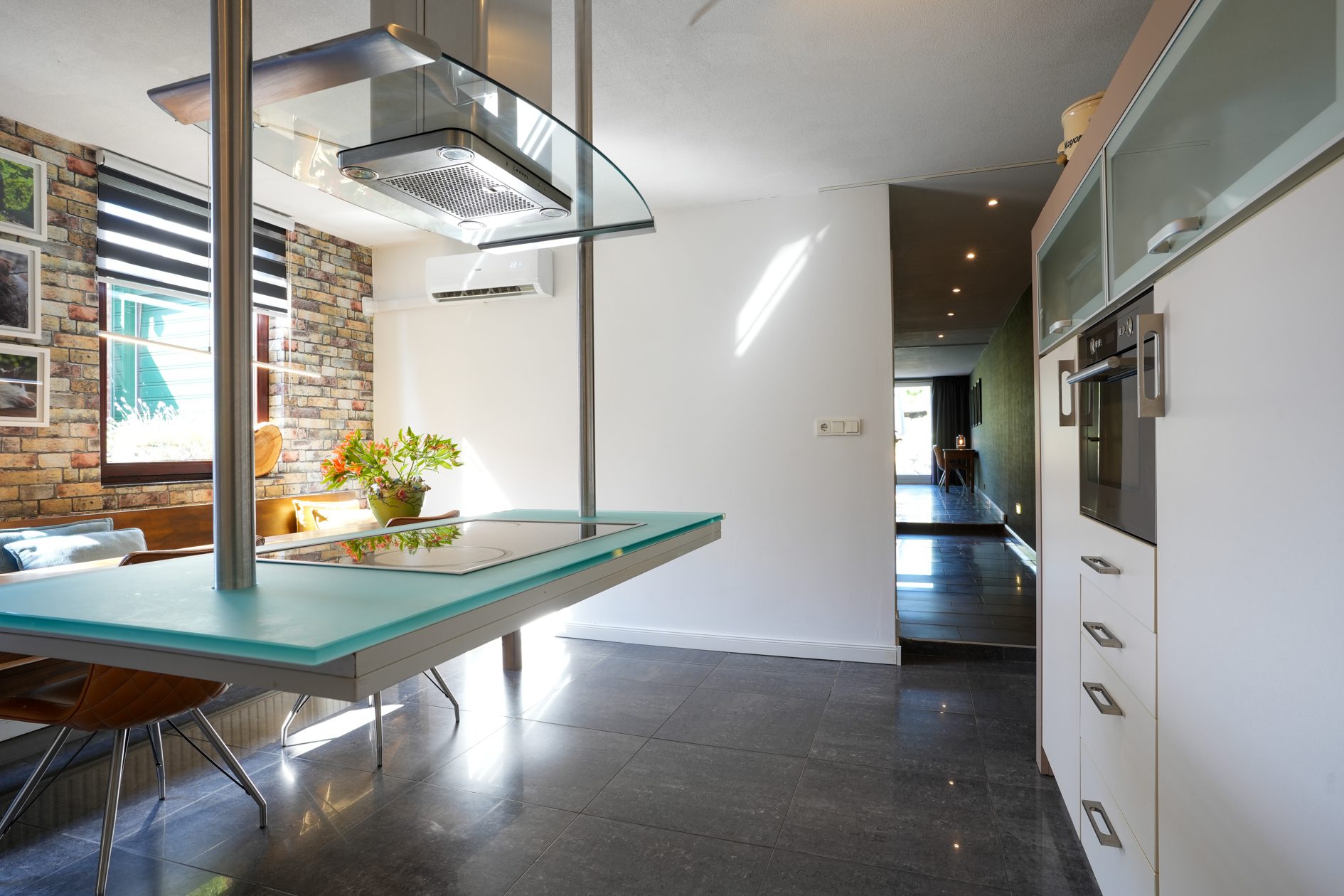 We lopen de woonkamer in. Door 2 extra ramen in de zijgevel te plaatsen is er een aangenaam lichte woonkamer ontstaan met een oppervlakte van ca. 30 m2. Met een moderne houtkachel met schouw en dezelfde moderne afwerking als in de hal is dit een heerlijke ruimte om de dag of avond door te brengen. Vanuit de woonkamer lopen we via een halfopen doorgang naar de gezellige woonkeuken van ca. 4.85 x 4.55 m, voorzien van een airco-installatie uit 2022. Dit is de eerste ruimte in de enorme aanbouw achter de oorspronkelijke hoofdbouw. Hier is in 2006 een unieke, luxe maatwerk inbouwkeuken geplaatst met een zwevend kookeiland, een hardglazen werkblad en voorzien van de gebruikelijke inbouwapparatuur (keramische kookplaat, oven, koelkast en vaatwasser).