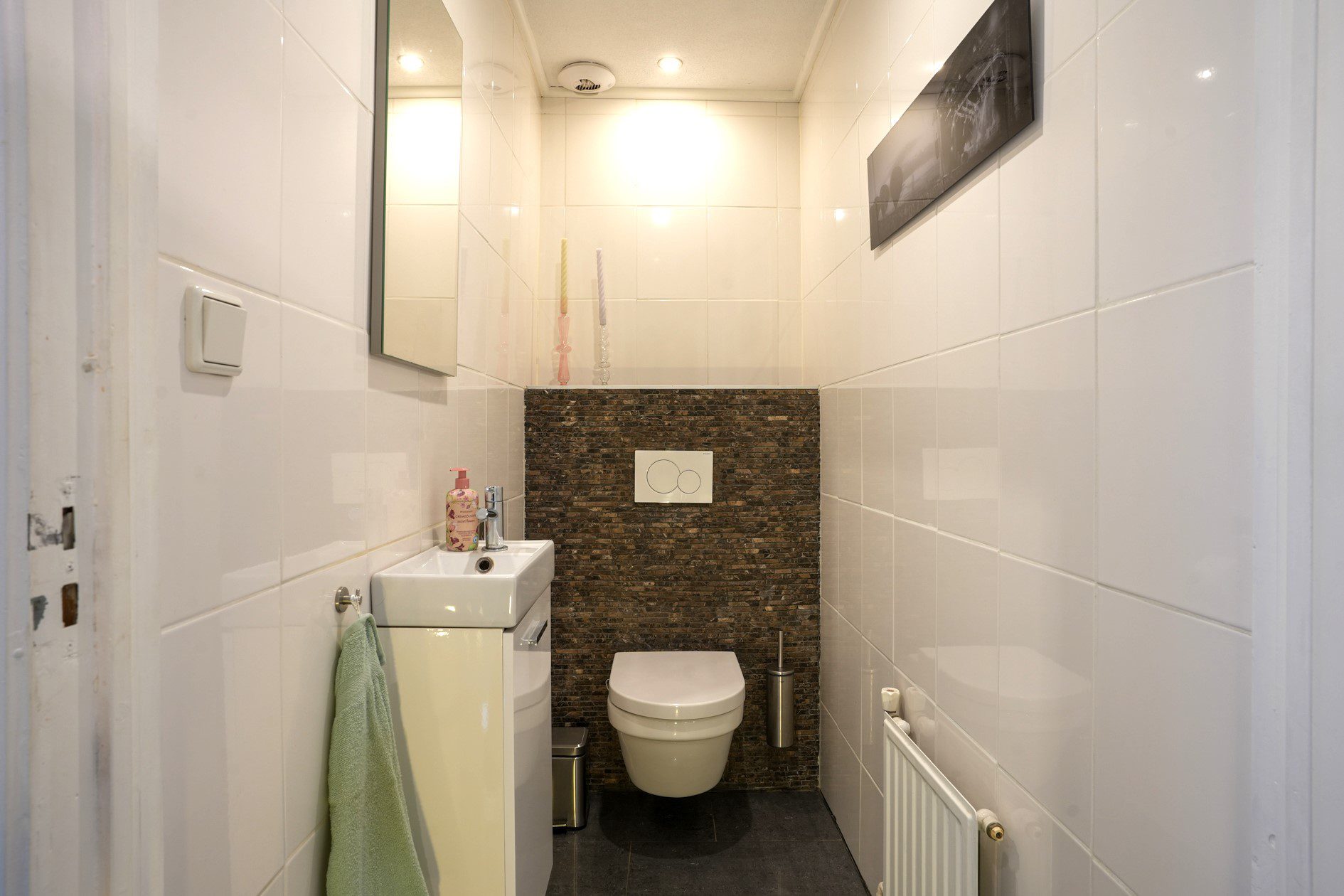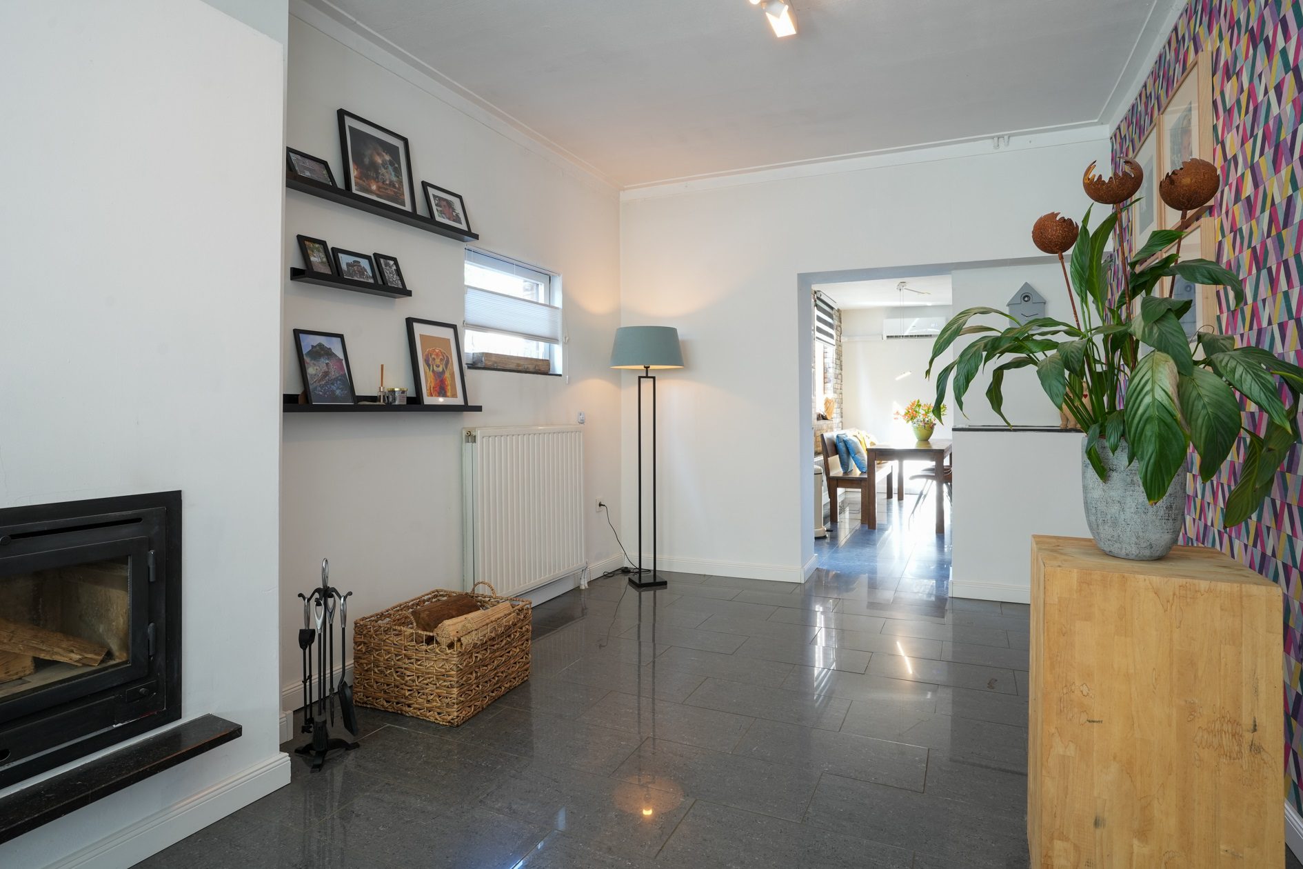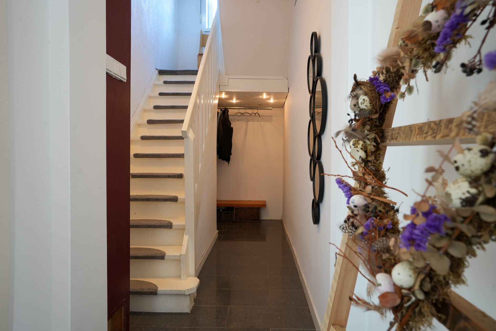Wij gaan via de voordeur! Dan kom je in een statige en karakteristieke jaren ‘30 ontvangsthal/gang van maar liefst bijna 8,5 m lang en met een riante plafondhoogte van net geen 3 m! Voorzien van recent uitgevoerd nieuw stucwerk wandafwerking (zoals op de gehele begane grond), hoogglans plavuizen, een praktische garderobenis en een mooie bordestrap naar de verdieping, is deze hal met recht een indrukwekkende en stijlvolle binnenkomer! In de hal bevindt zich ook de meterkast die in 2022 is vernieuwd en is voorzien van een uitgebreide groepenkast met moderne schakelautomaten.