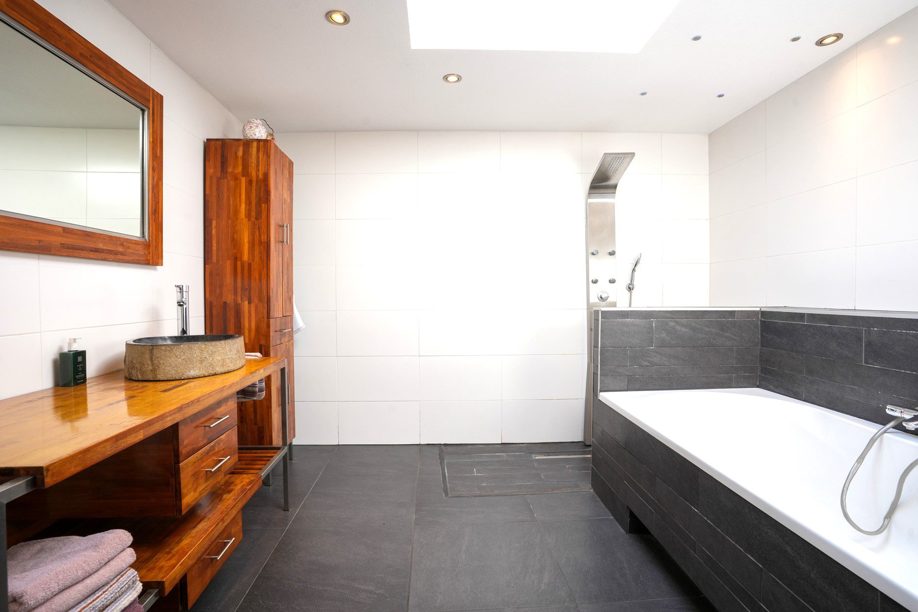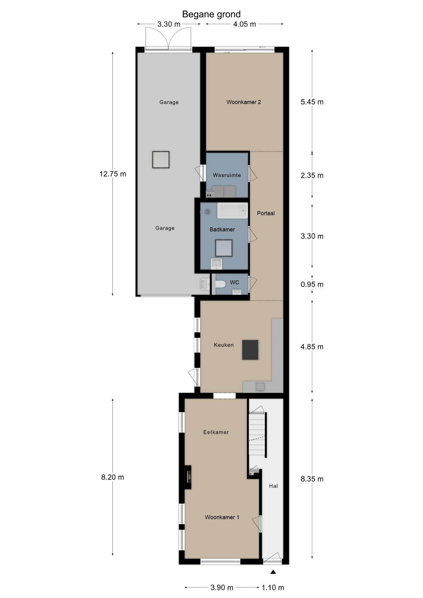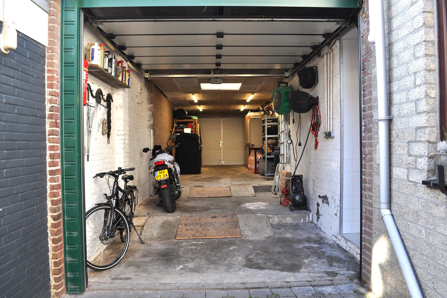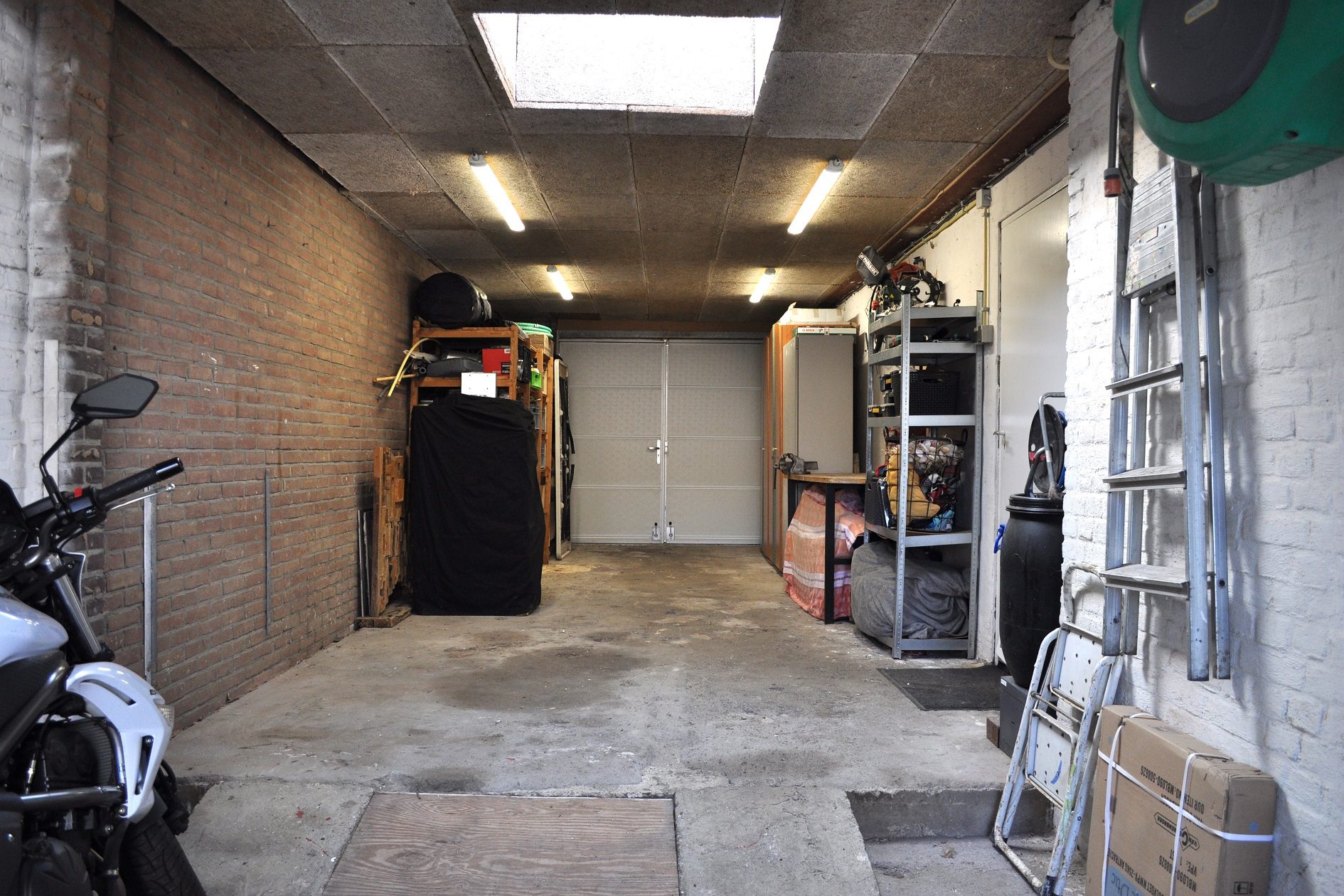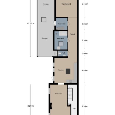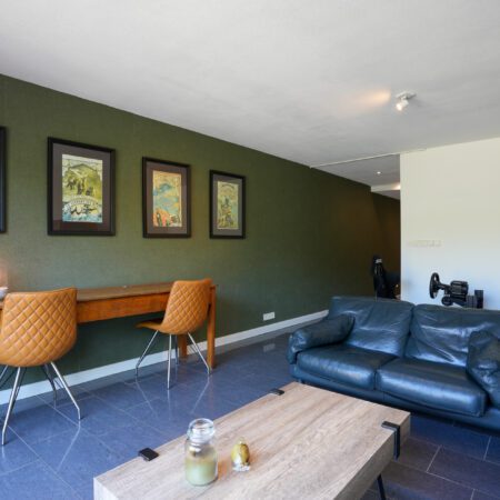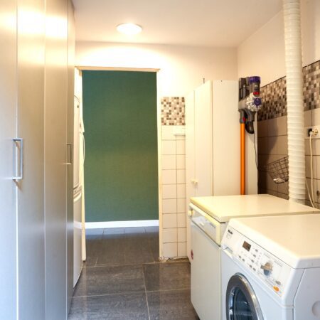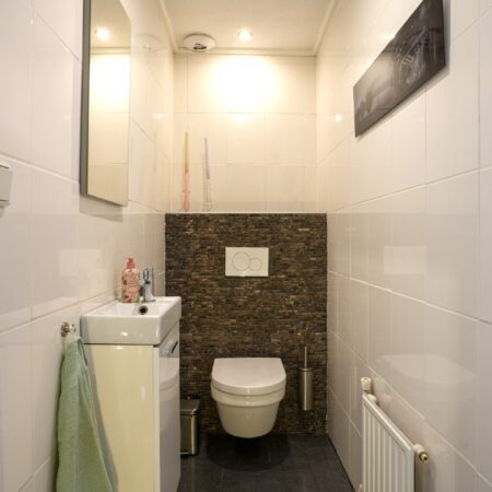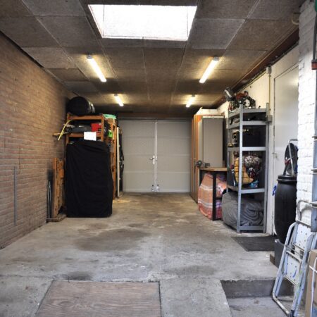 Vanuit de keuken is er een open doorgang naar een gang van maar liefst 8,5 m lengte waar voor het realiseren van een riante lichtstraat al een vergunning is afgegeven. Deze gang biedt toegang tot allereerst het toilet. Gerenoveerd in 2016, geheel betegeld en voorzien van een wandcloset met een fonteintje in meubel. Aansluitend bevindt zich een comfortabele, moderne badkamer van ca. 3.30 x 2.65 m. Geheel betegeld en voorzien van een wastafelmeubel, ligbad, inloopdouche, een sierradiator en een plafond met spots en een grote, te openen lichtkoepel! Via de gang lopen we door naar de deels betegelde wasruimte waar naast de witgoedaansluitingen ook de van Hesi gehuurde cv-combiketel (Bosch HRC30 CW5) uit 2010 is geplaatst en van waaruit je een inpandige toegang hebt naar de garage. Aan het einde van de gang bevindt zich een tweede woonkamer van ca. 5.45 x 4.05 m, voorzien van vloerverwarming, een gevelbrede schuifpui voor maximaal tuincontact en uiteraard eveneens strak en modern afgewerkt. Deze woonkamer is tevens te gebruiken als riante slaapkamer op de begane grond of als kantoor aan huis of als … noem het maar op. Zoals eerder vermeld, kun je inpandig via de wasruimte naar de garage. Dit is megagrote, multifunctionele ruimte met een oppervlakte van maar liefst ca. 42 m2. De garage is voorzien van een elektrische bedienbare sectionaalpoort aan de voorzijde en dubbel openslaande garagedeuren aan de achterzijde, zodat de achtertuin ook via de garage bereikbaar is! Verder is hier aanwezig een lichtkoepel, elektra en water. Deze ruimte kan, indien gewenst gesplitst worden in deels garage en deels magazijnruimte voor je eigen bedrijf, maar is tevens groot genoeg om een gedeelte daarvan te betrekken bij de tweede woonkamer om deze bijvoorbeeld te transformeren tot mantelzorgwoning, guesthouse etc.