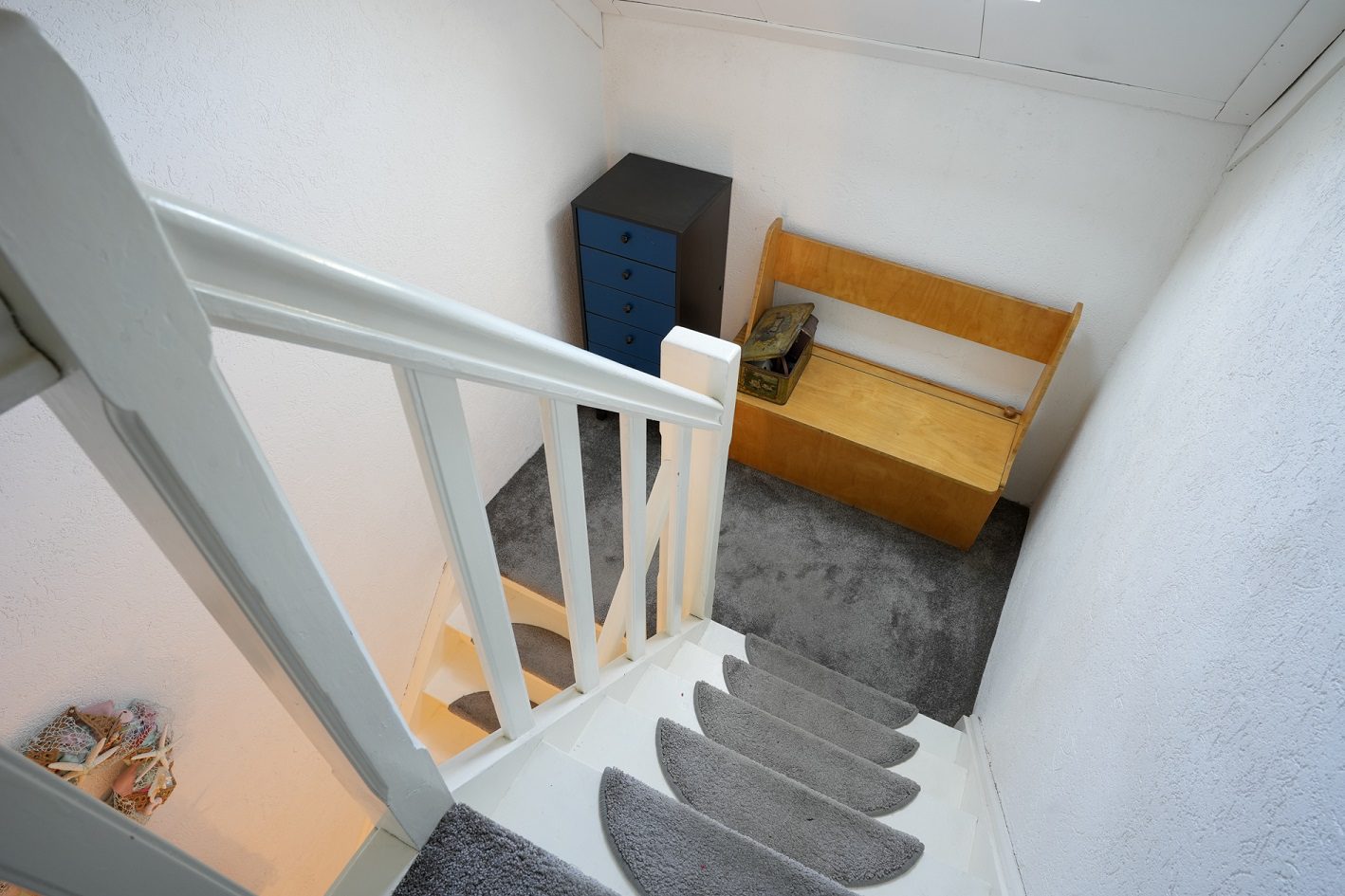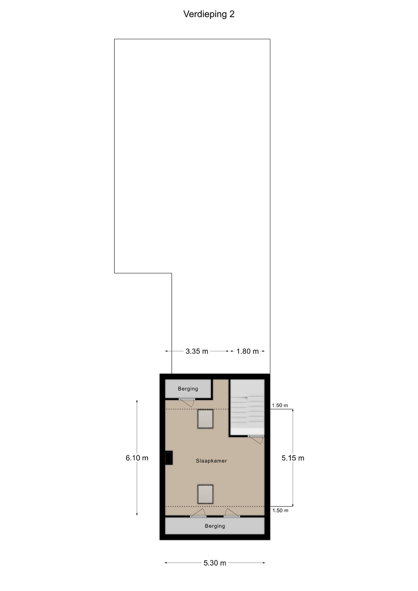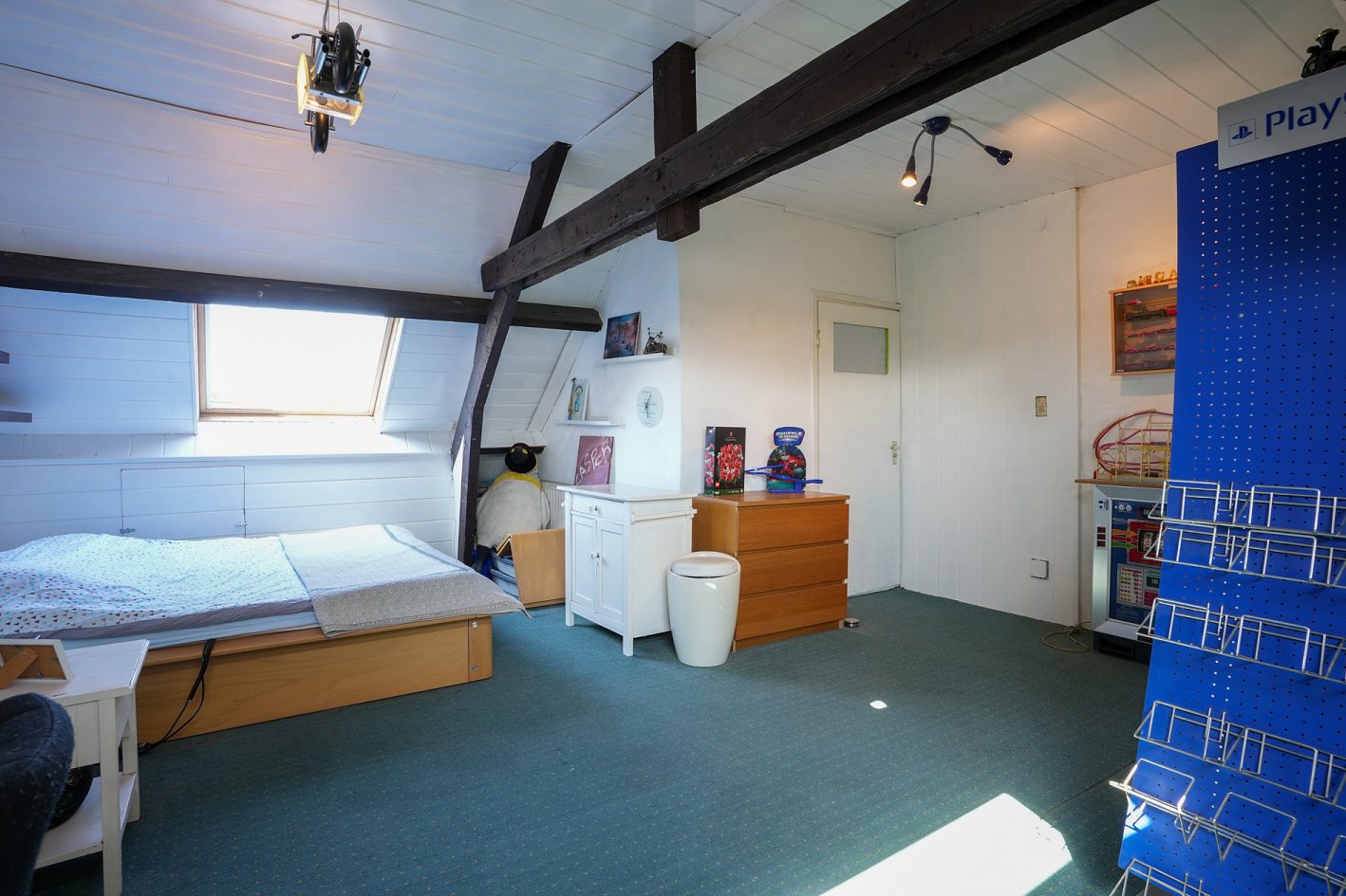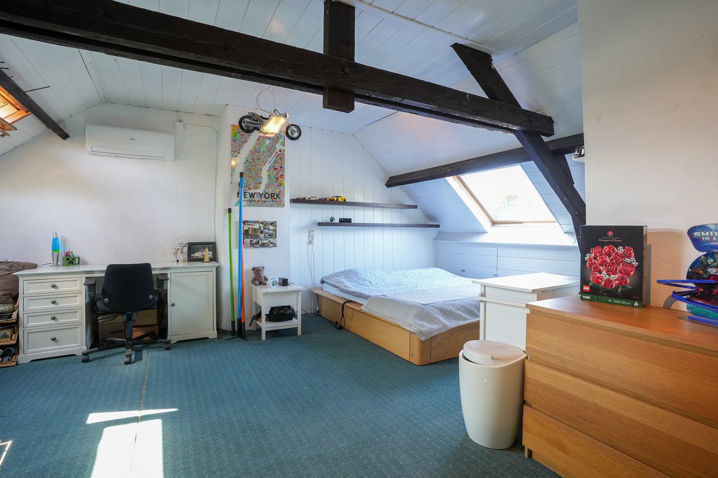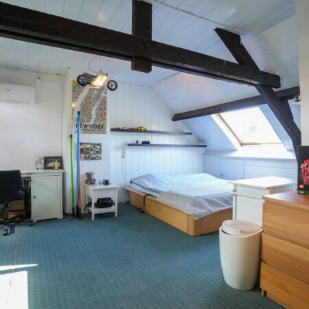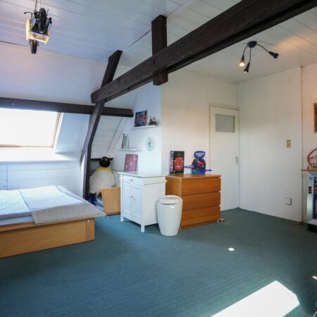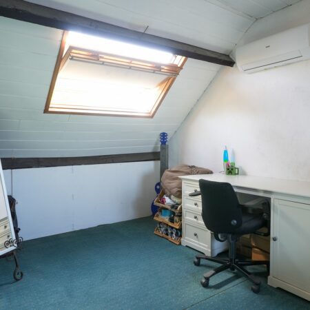 Via wederom een mooie bordestrap komen we uit op de zolderverdieping die getransformeerd is tot een ruime derde slaapkamer van ca. 5.30 x 5.15 m, gemeten vanaf 1.50 m plafondhoogte. Voorzien van 2 grote Velux dakramen, een airco installatie uit 2022 en 2 separate bergruimtes!