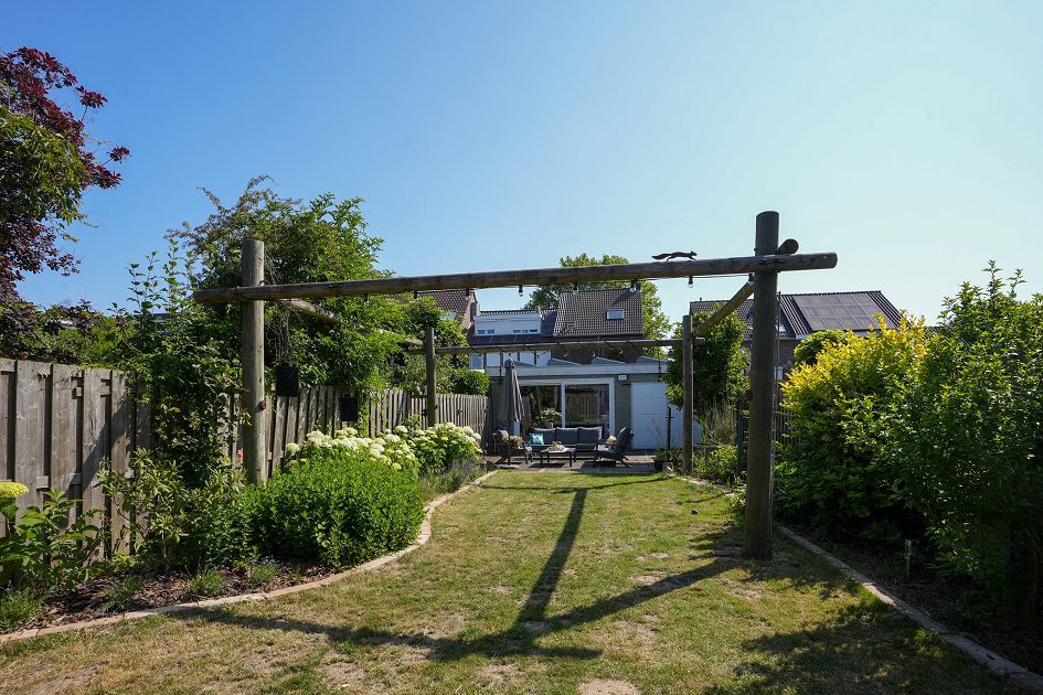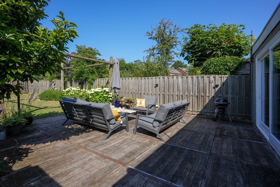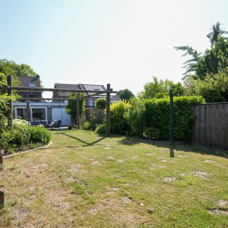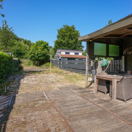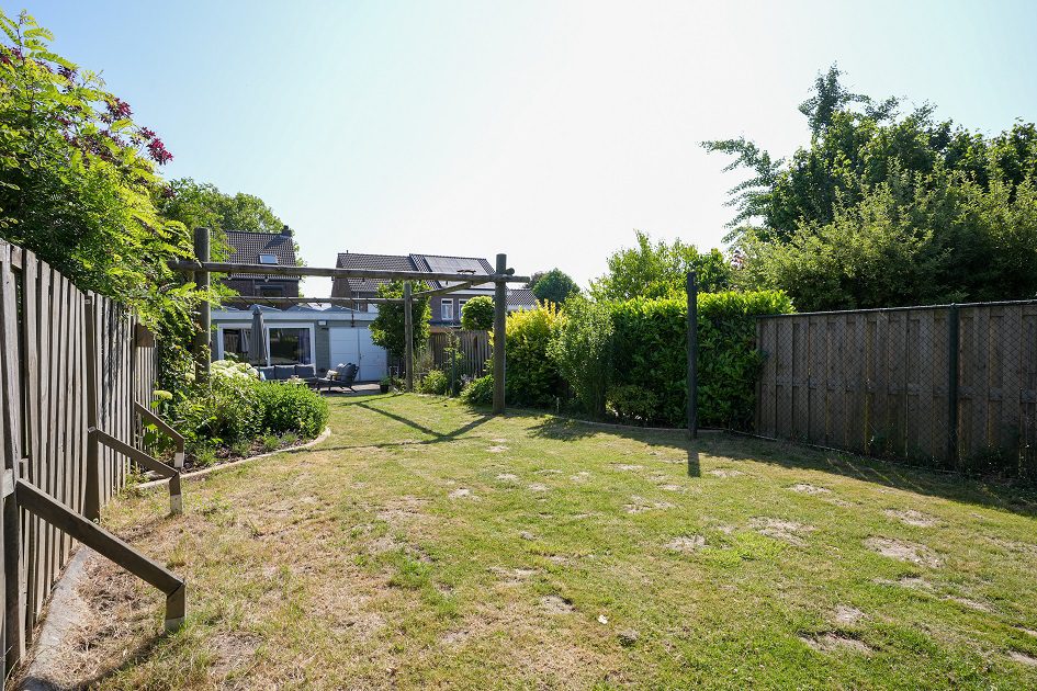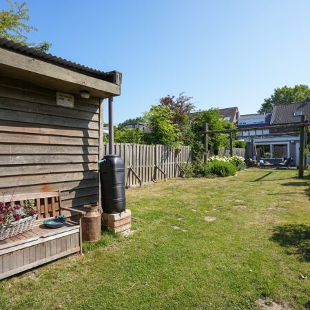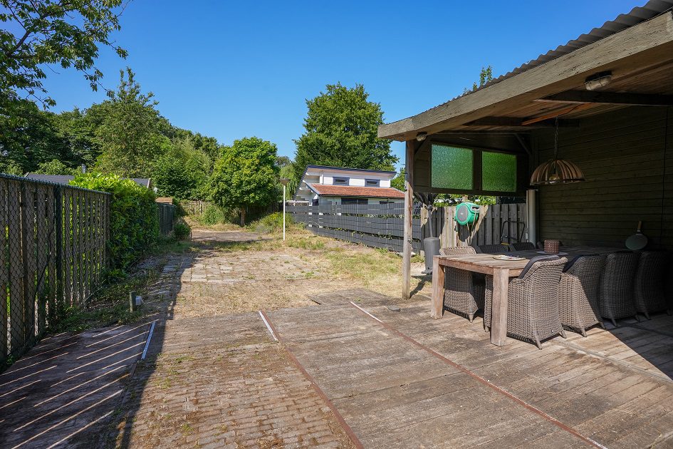 Vanuit de tweede woonkamer lopen we de achtertuin in. Met een diepte van ca. 52 m, een uitstekende bezonning en optimale privacy is dit een heerlijke plek om te ontspannen op het bij de tuinkamer gelegen terras of straks misschien in je eigen zwembad. In de achtertuin bevindt zich een houten tuinberging van ca. 4.35 x 2.90 m met aansluitend een overdekt terras van ca. 3.20 x 2.90 m. We lopen weer terug naar de woning want er is nog veel meer om te bekijken.