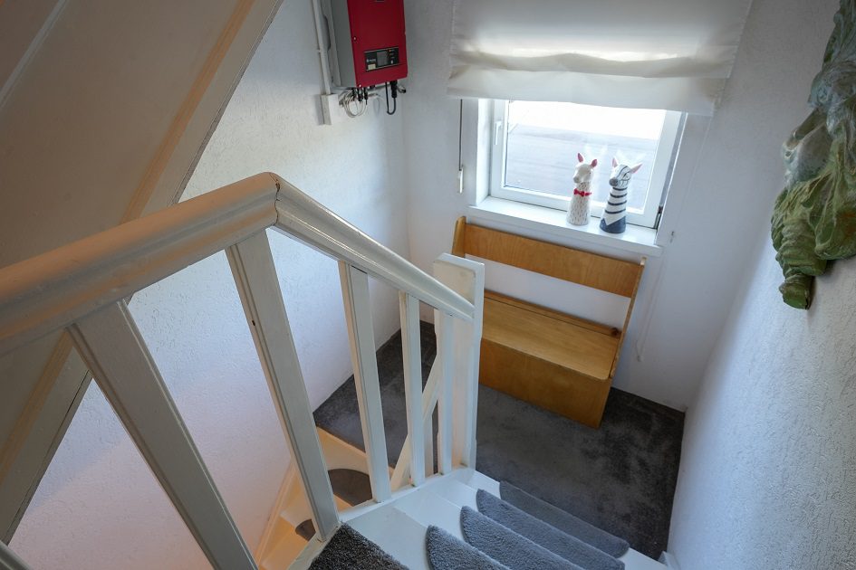 In de ontvangsthal bevindt zich achter de trap de toegang naar een praktische provisiekelder van ca. 5.05 x 3.90 m met een plafondhoogte van ca. 1.90 m.