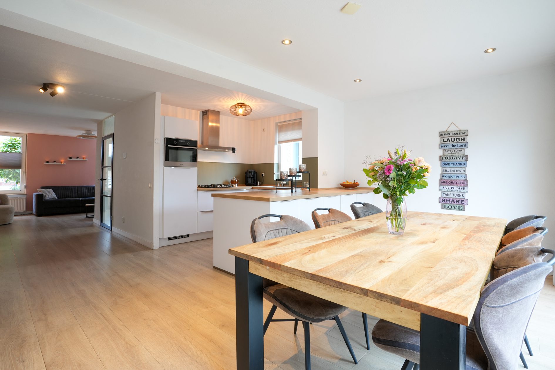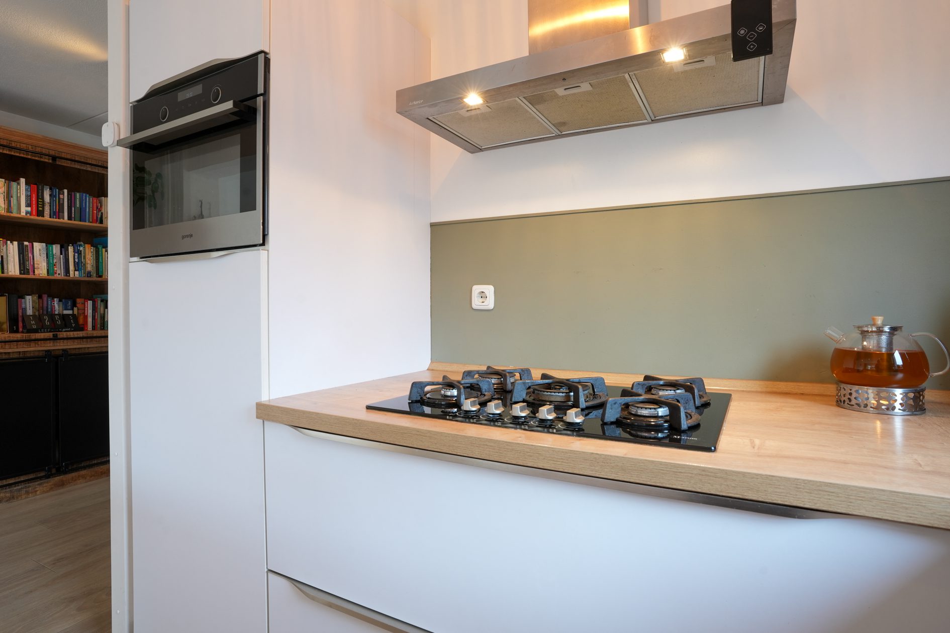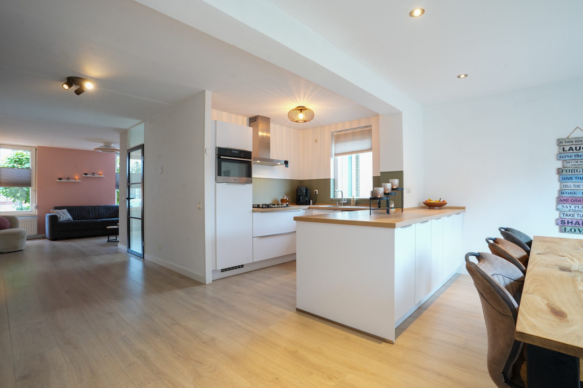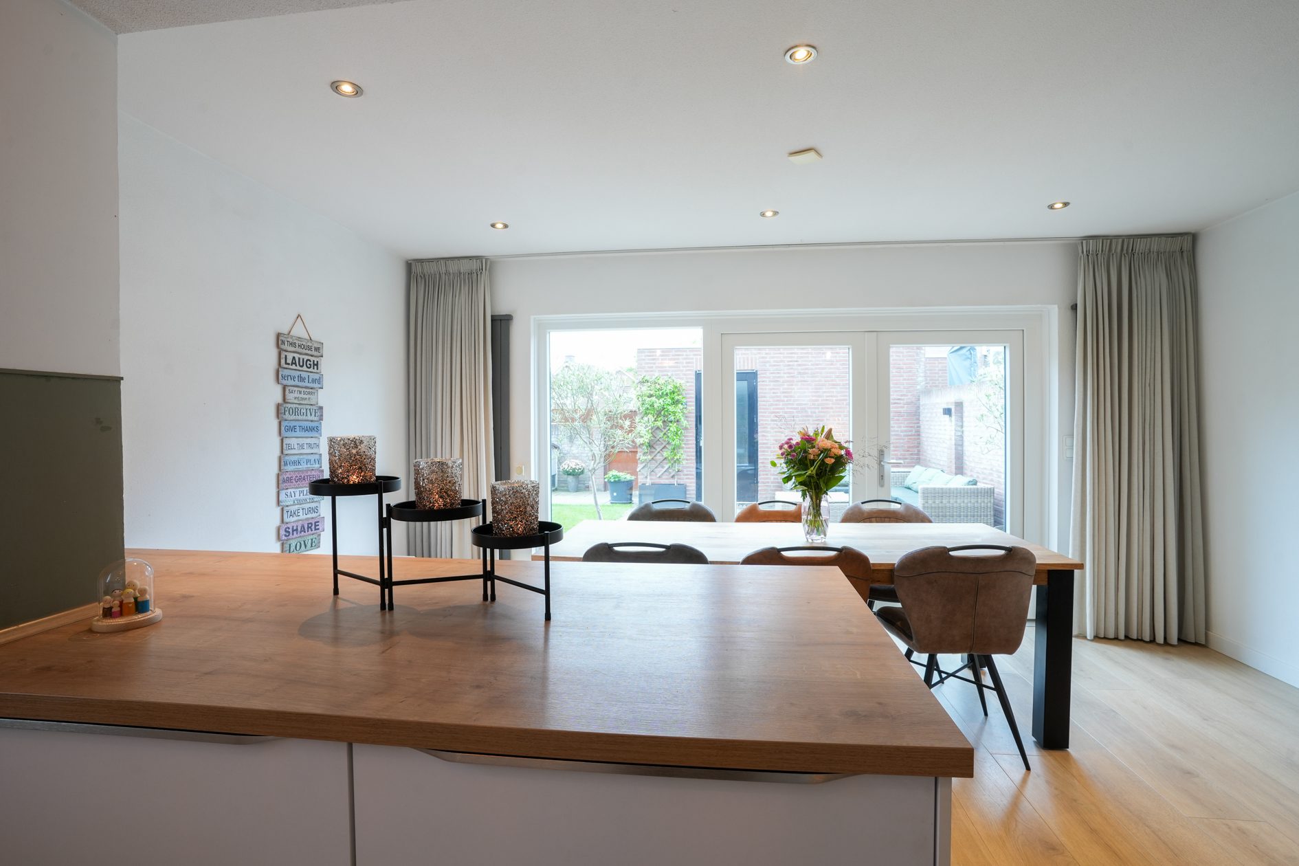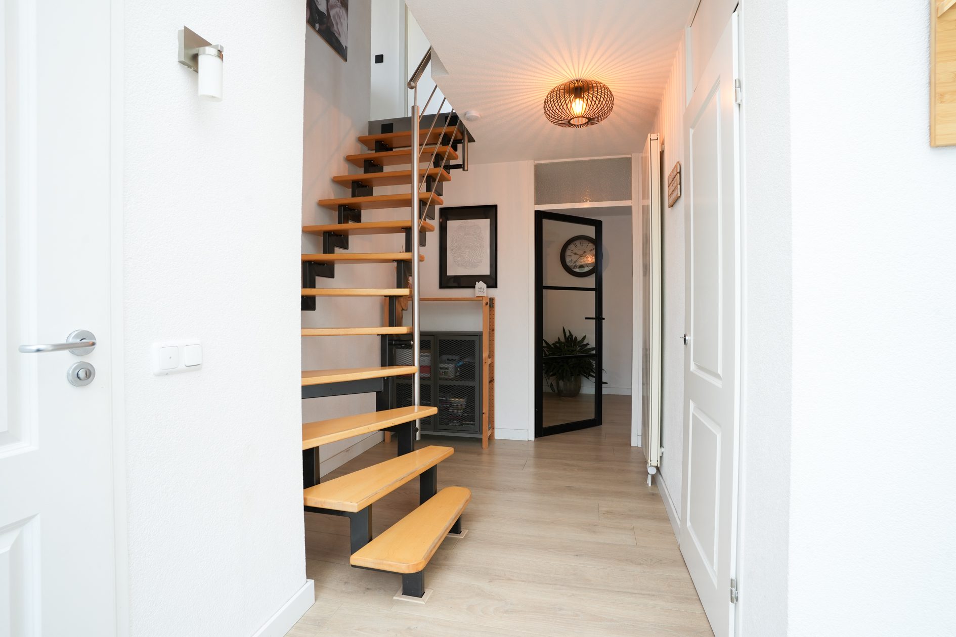 De entree van deze mooie woning ligt in de zijgevel, aan de Van Doesburglaan. Je staat voor de woning en er valt meteen iets op. De tuin rondom de woning is recent aangelegd, onderhoudsvriendelijk en voorzien van trendy cortenstaal tuinelementen. Daarnaast zie je een fraaie entree naar de woning die als het ware is aangebouwd en is voorzien van een brede lichtstraat. Eenmaal in de royale hal ervaar je de heerlijke hoeveelheid lichtinval hierdoor! De lichtstraat loopt door in het toilet en aan de andere kant in de berging annex garderobe. In de hal bevindt zich verder een open designtrap naar de verdieping, een moderne meterkast, een sierradiator en de toegang naar de living middels een glazen deur. Het ruim bemeten gastentoilet uit 2020 is voorzien van een moderne betonlook vloer, glad stucwerk wandafwerking, een wandcloset en een fonteintje. We lopen de living in. Door de aanbouw aan de achterzijde (met vloerverwarming, een gevelbrede glazen pui en openslaande tuindeuren) is hier een heerlijke, ruime en open leefruimte tot stand gekomen van in totaal ca. 52 m². Bewust is ervoor gekozen om de eetkamer in de aanbouw te situeren. Hierdoor is er naast een optimaal tuincontact ook een directe verbinding met de open keuken die zich in het midden van de living bevindt. In de keuken is in 2016 een moderne installatie in U-opstelling geplaatst, voorzien van een spoelbak, 5-pits gaskookplaat met wokbrander, rvs afzuigkap, oven-/magnetroncombinatie, koelkast en vaatwasser. De gezellige L-vormige woonkamer (met o.a. een groot hoekraam) bevindt zich aan de voorzijde van de woning. Hier is een extra wand met uitsparingen geplaatst waarin o.a. de TV fraai in geïntegreerd kan worden.