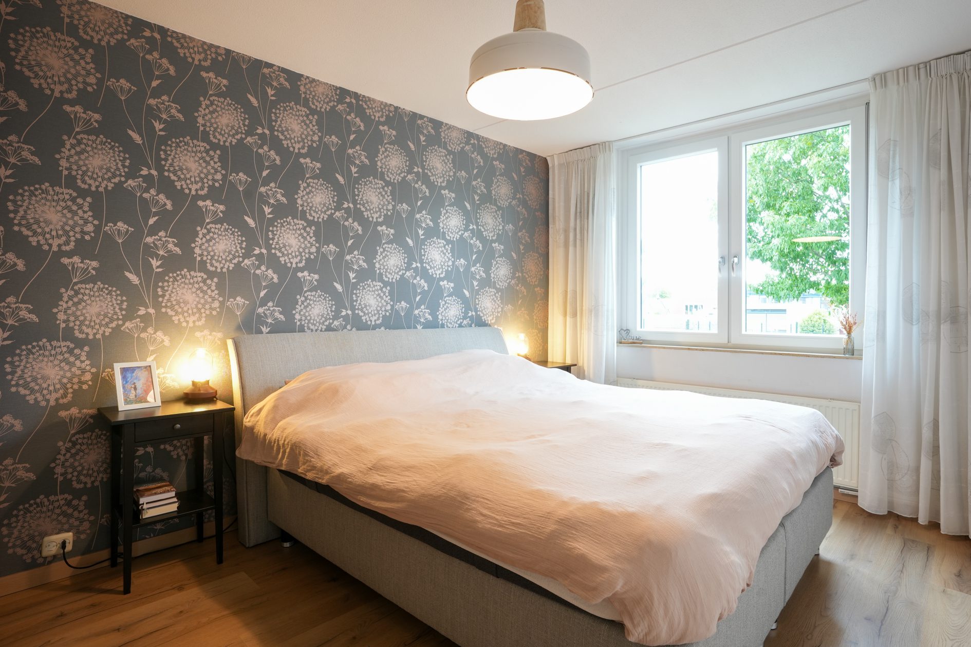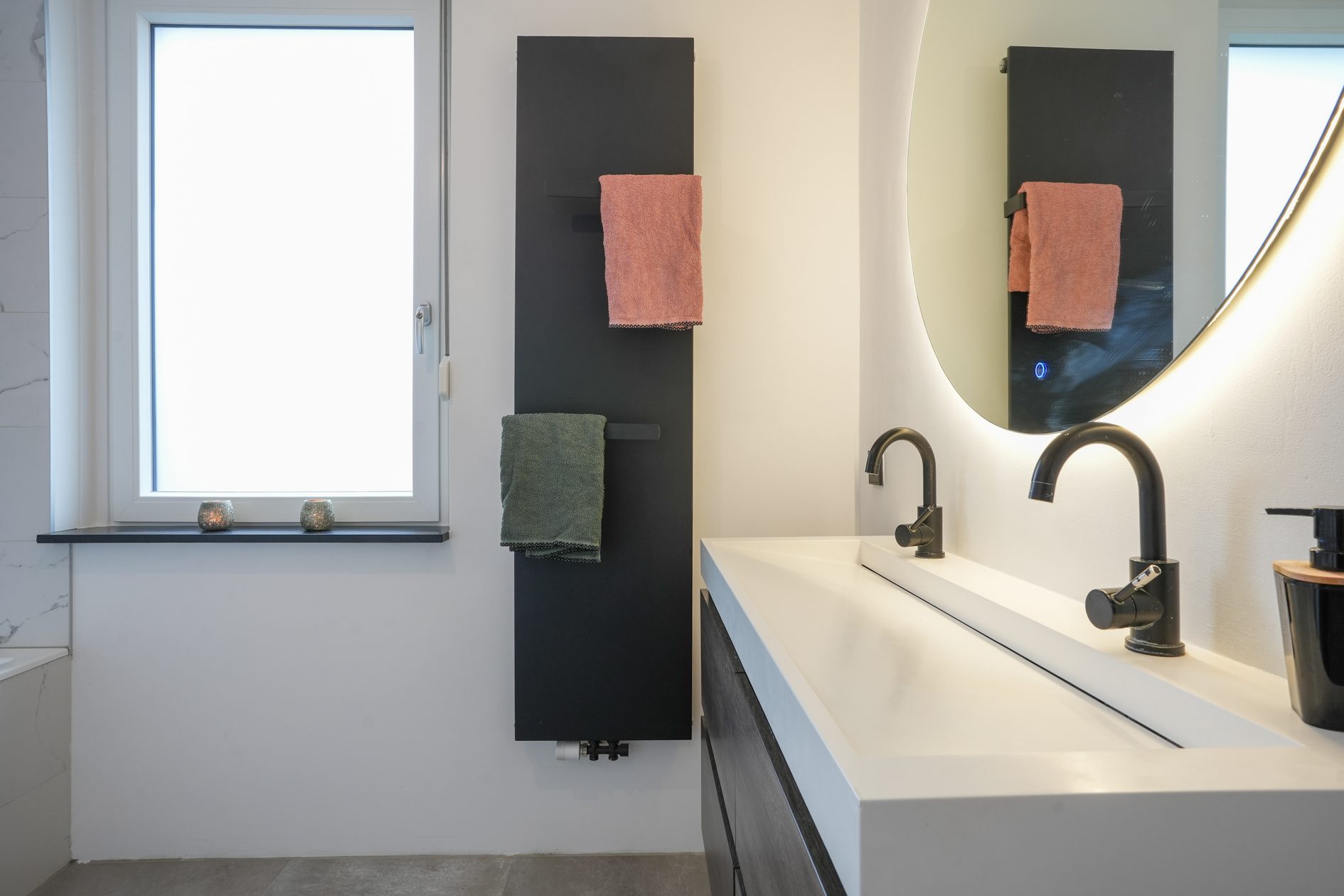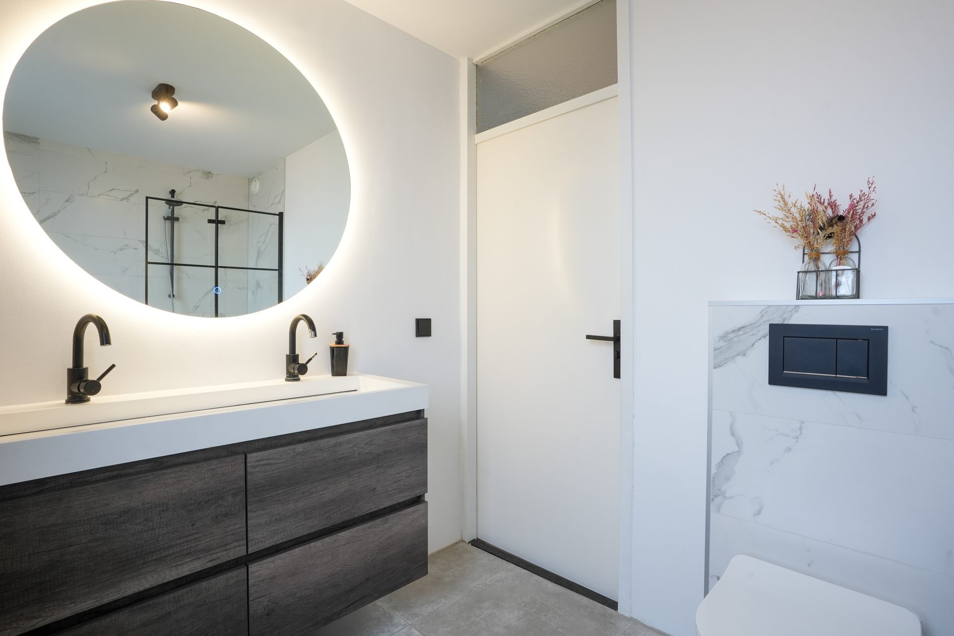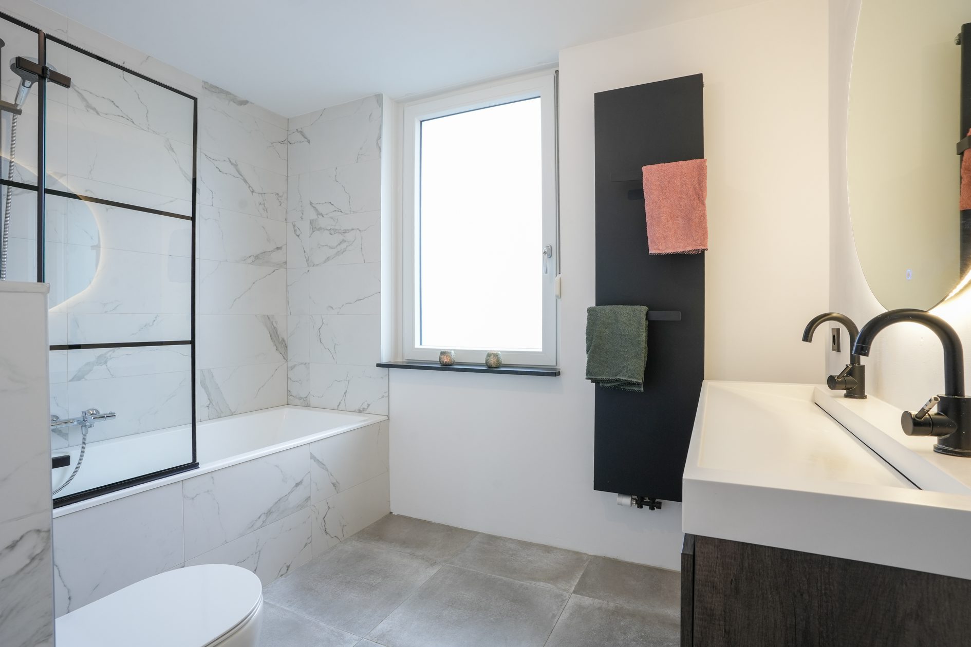 Via de open designtrap in de ontvangsthal lopen we naar boven en komen daar uit op een ruim bemeten overloop, voorzien van een luxe rvs balustrade. De overloop geeft toegang tot de badkamer en 3 comfortabele slaapkamers van respectievelijk ca. 4.40/3.80 x 3.12 m, ca. 3.74 x 2.14 m en ca. 3.83 x 2.00 m. De gehele verdieping (m.u.v. de badkamer) is voorzien van een moderne, luxe laminaatvloer. De luxe badkamer van ca. 2.91 x 2.22 m is in 2020 volledig vernieuwd, deels betegeld met marmerlook wandtegels en betonlook vloertegels en voorzien van een ligbad/douchecombinatie, een trendy, dubbel wastafelmeubel, spiegel met geïntegreerde verlichting, een wandcloset en een handdoekradiator. Alle ruimtes (inclusief de overloop) zijn voorzien van een gevelraam, zodat ook op de verdieping sprake is van een aangename hoeveelheid lichtinval. Tevens zijn alle gevelramen (m.u.v. de entree) voorzien van rolluiken.