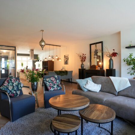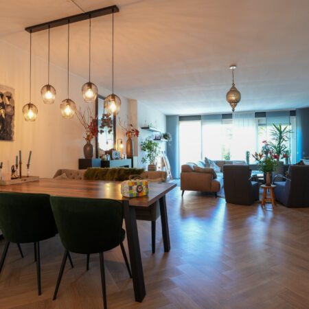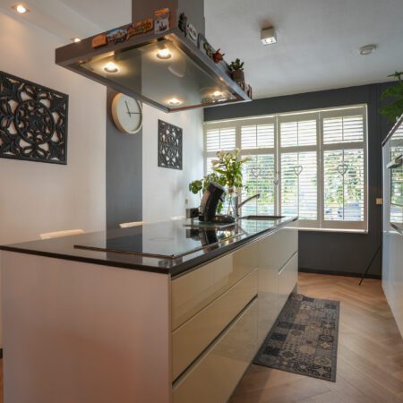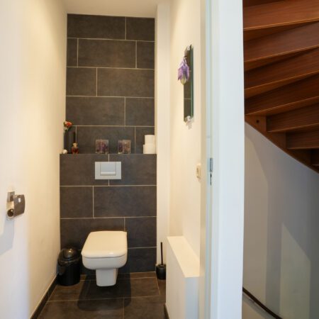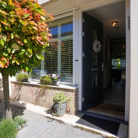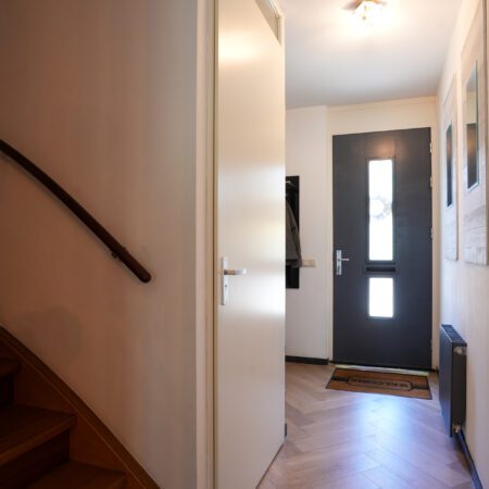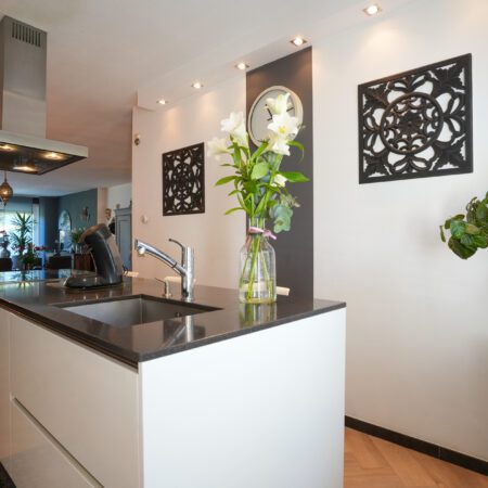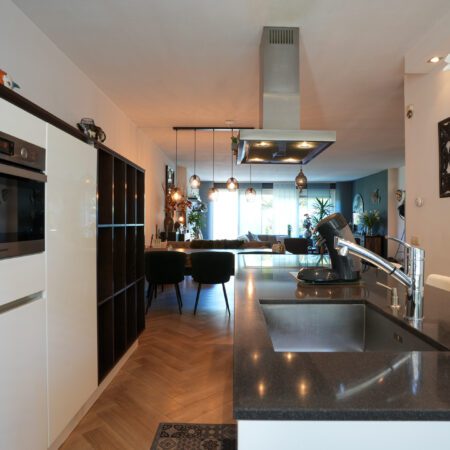 Via een prachtig aangelegde voortuin komen we bij de entree van deze mooie woning. We lopen naar binnen. In de hal valt al meteen op dat de huidige bewoners hun huis met veel zorg en liefde hebben bewoond! De afwerking is strak en modern. In de hal bevindt zich een garderobenis, een luxe gastentoilet met wandcloset en fonteintje, een uitgebreide moderne meterkast, de unit van de stadsverwarming (voor verwarming en warm water) en een gesloten (extra brede) Essenhouten trap naar de verdieping. Via een glazen deur lopen we in de riante living met open keuken binnen. Tijdens de bouw is gekozen voor de optionele uitbreiding van de begane grond waardoor er een heerlijke leefruimte van maar liefst ca. 62 m2 is ontstaan. Aan de voorzijde van de woning bevindt zich de open keuken, voorzien van een ruim kookeiland met hardstenen werkblad, zitgedeelte, inductiekookplaat, afzuigkap, spoelbak en vaatwasser. Tegenover het kookeiland is een bijbehorende kastenwand geplaatst met daarin veel opbergruimte, de combimagnetron/oven en de koelkast. In de middensectie van de living is de eetkamer gesitueerd met een praktische bergkast onder de gesloten trap naar de verdieping. We lopen naar de achterzijde van de woning naar de gezellige woonkamer met een elektrische haard in schouw. Door de gevelbrede schuifpui is er vanuit de woonkamer maximaal zicht op de schitterende achtertuin en mocht de zon te fel worden dan pak je de afstandsbediening voor de elektrisch bedienbare zonwering! De gehele begane grond is modern en strak afgewerkt met een visgraat pvc-vloer, glad stucwerk wandafwerking en in de keuken een plafond met spots. We gaan naar buiten om te genieten van de prachtig aangelegde achtertuin. Daar bevindt zich een stenen buitenberging van ca. 2.70 x 2.50 m voorzien van elektra. Via een afsluitbare poort loop je naar je eigen parkeerplaats (eigendom), gelegen direct achter de achtertuin en op het gezamenlijke privé parkeerterrein die d.m.v. elektrisch bedienbare poort (handzender) afgesloten en geopend kan worden. Ook bezoekers mogen van dit terrein gebruik maken. Tevens bevindt zich hier een fietsenstalling waar voor deze woning 2 fietsplaatsen beschikbaar zijn. Het gezamenlijke parkeerterrein wordt beheerd door een Vereniging van Eigenaren. De maandelijkse servicekosten voor het gebruik en onderhoud hiervan bedragen € 20,- per maand.