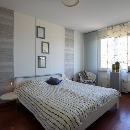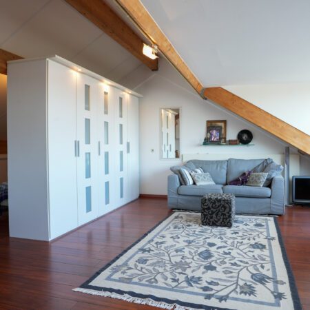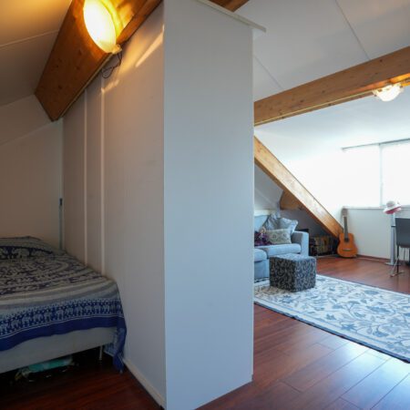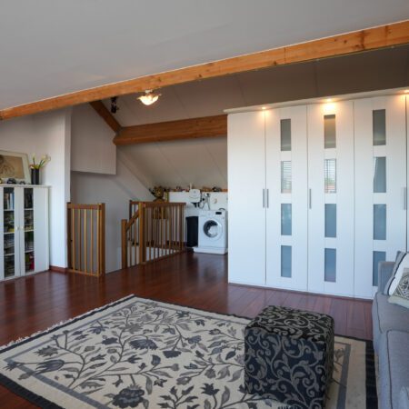 Vanaf de overloop van de eerste verdieping lopen we via een eveneens extra brede, in Essenhout uitgevoerde gesloten trap naar de tweede verdieping. Hier kom je in een grote ruimte van ca 7.10 x 5.70 m (gemeten vanaf een hoogte van 1.50 m) die is afgewerkt en ingericht als vierde slaapkamer met een grote kledingkast als roomdivider naar de was- c.q. bergruimte. Een fantastische slaapkamer, mede door de riante stahoogte en last but not least door de mega dakkapel van ca. 4.40 m breedte (niet standaard).