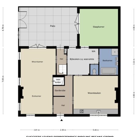 De woonkamer van ca. 4.75 x 4.70 m bevindt zich aan de voorzijde van de woning en is voorzien van een schouw met rookkanaal. Vanuit de woonkamer is er toegang naar de wasruimte van ca. 3.80 x 2.35 m waar de witgoedaansluitingen zijn geplaatst. Van daaruit is er toegang naar een separaat toilet en een badkamer (met wastafel en ligbad/douchecombinatie), de inpandig bereikbare garage en een portaal aan de achterzijde van de woning met moderne meterkast (7 groepen met zekeringautomaten en aardlekschakelaar) en met een gesloten trap naar de verdieping. De garage van ca. 4.70 x 4.50 m beschikt over een wateraansluiting met stortbak en een vaste open trap naar een bergzolder met dezelfde vloeroppervlakte en een vast gevelraam.