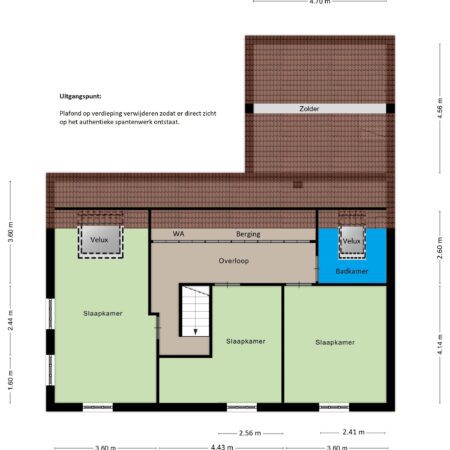De zolderverdieping van ca. 11.75 x 4.15 m is te bereiken d.m.v. een vaste trap vanuit de berging op de eerste verdieping. Door de aanwezigheid van 3 kleine dakkappellen en een deels nog authentiek spantenwerk is deze ruimte uitermate geschikt om te transformeren in bijvoorbeeld een riante, romantische master-bedroom.