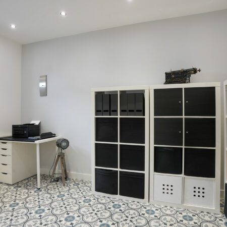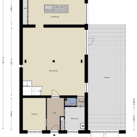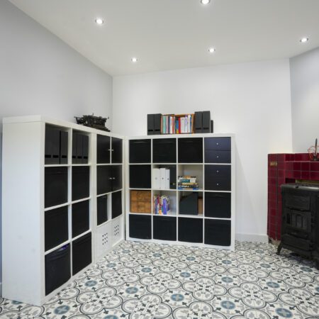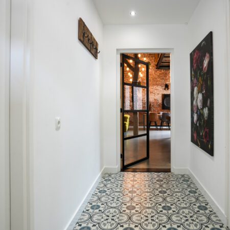 Je kunt deze woning binnengaan via de voordeur in de voorgevel of via de toegangspoort naar de binnenplaats rechts van het pand (met loopdeur in een grote raampartij in de zijgevel). Wij nemen deze keer de formele route via de voorzijde en komen binnen in een ontvangsthal van ca. 3.95 x 2.10 m. Links daarvan bevindt zich een praktische werkkamer (of kantoor aan huis) van ca. 3.95 x 2.80 m met nog aanwezig een authentieke schouw. Rechts van de hal bevindt zich de bijkeuken annex technische ruimte van ca. 2.85 x 2.40 m. Naast een uitgebreide meterkast (geen gasaansluiting) zijn hier de witgoedaansluitingen geplaatst alsmede de Mitsubishi Ecodan warmtepomp (eigendom en bouwjaar 12-2023) met elektrische warmwaterboiler. Op het dak liggen 28 zonnepanelen (in eigendom). Zowel via de bijkeuken als via de woonkamer is een portaal bereikbaar van waaruit de toegang naar het gastentoilet. Deze is voorzien van een wandcloset en fonteintje. Het tot nu toe beschreven gedeelte van de woning beschikt over, voor een woonboerderij zo kenmerkende, sfeervolle decortegels als vloerafwerking. De gehele begane grond is voorzien van vloerverwarming.