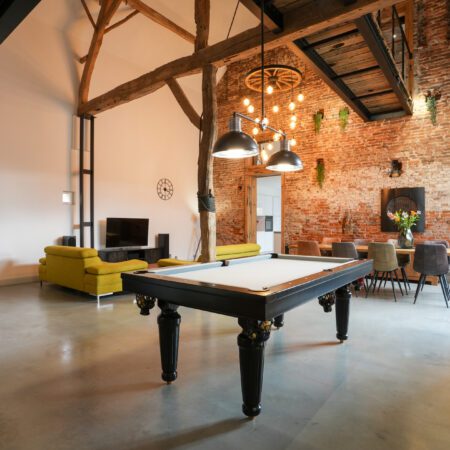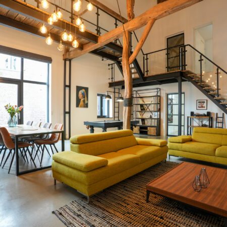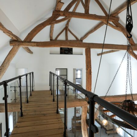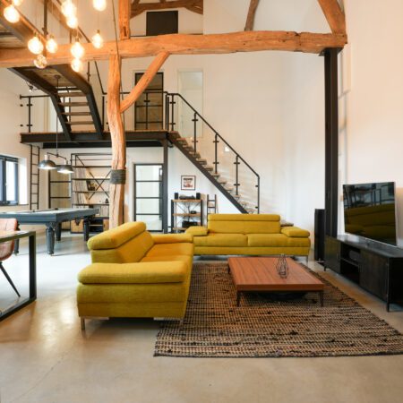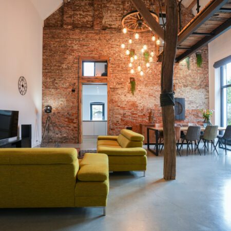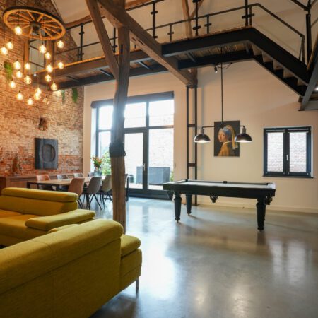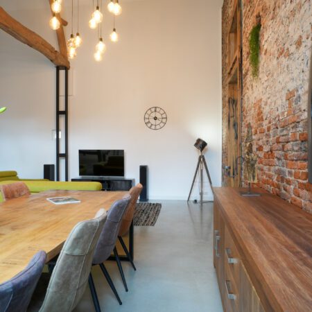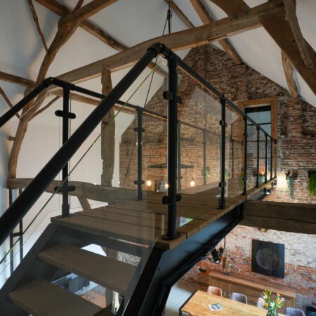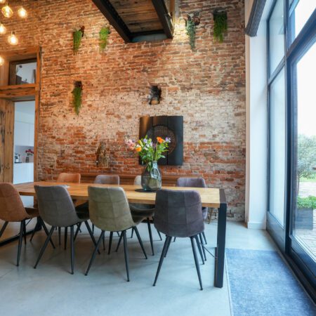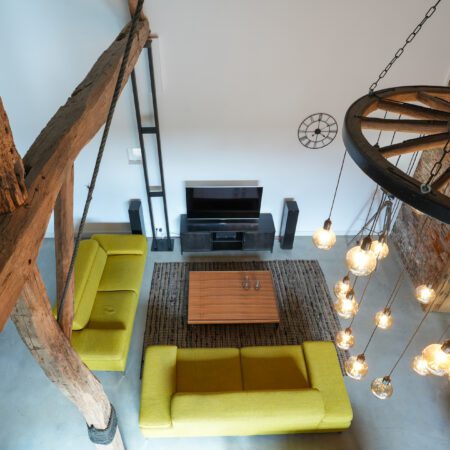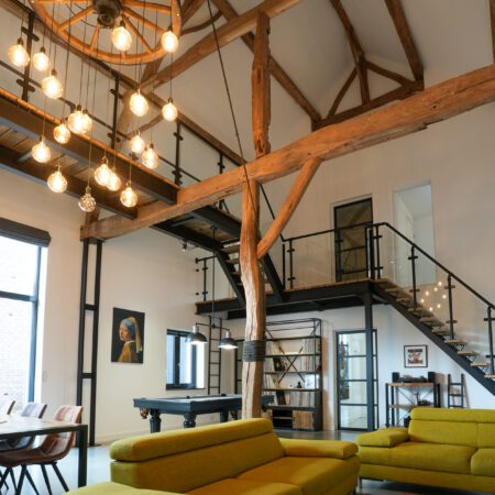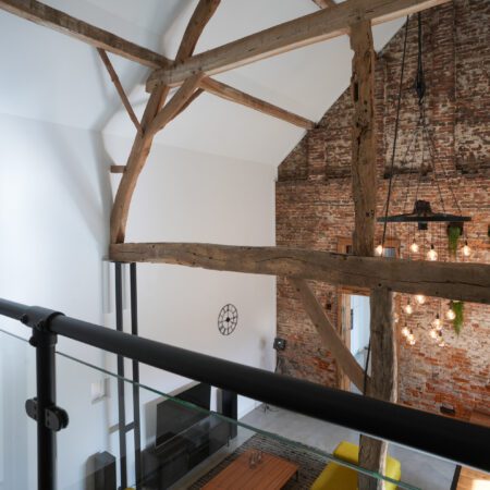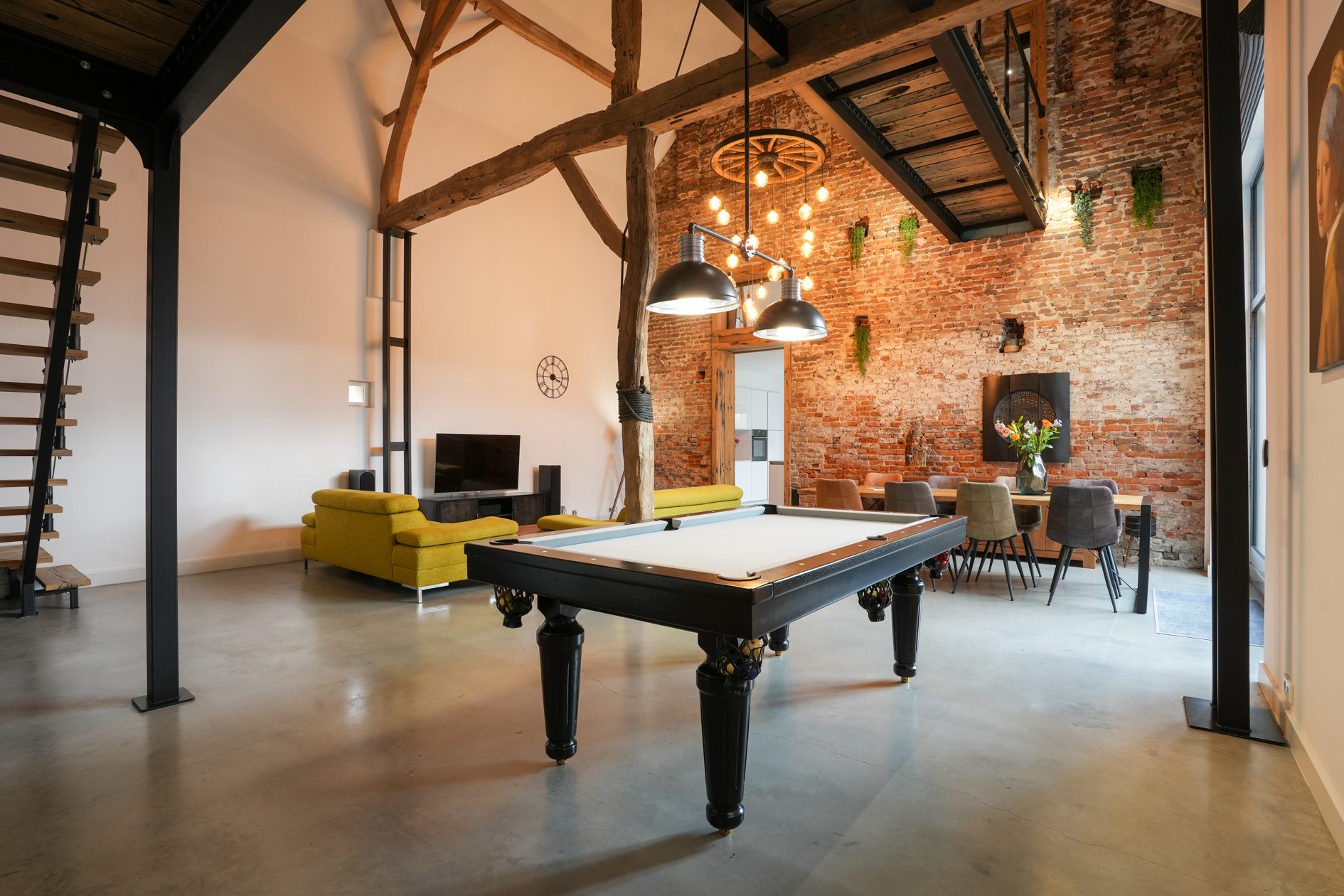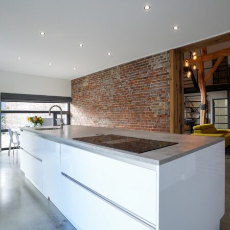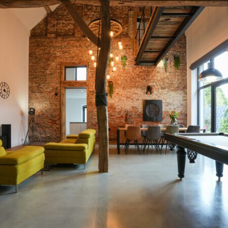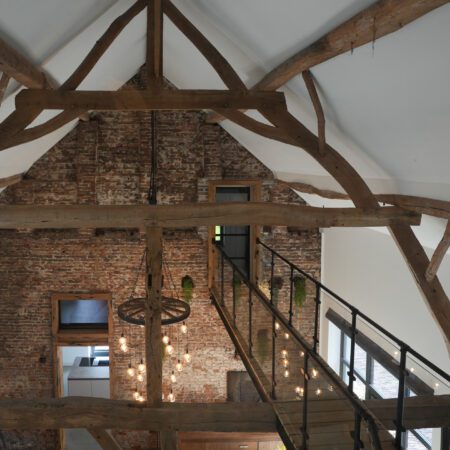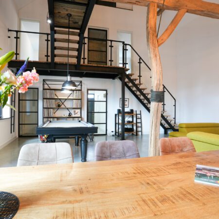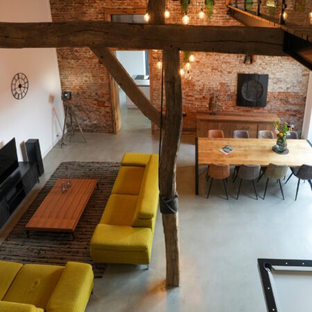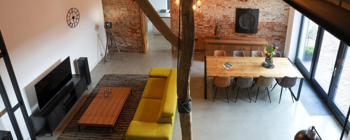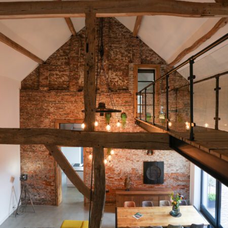 Vanuit de ontvangsthal heb je al zicht op wat komen gaat door de antraciet toegangsdeur met glazen panelen. We lopen naar binnen en komen in een adembenemend mooie living van ca. 8.30 x 7.55 m. Je weet niet wat je ziet! Alle omringende ruimtes worden door middel van inpandige ramen en deuren met de living verbonden. Deze living vormt dan ook het centrale hart van het gehele pand en bestaat uit 1 grote open ruimte tot aan de nok van het dak. Deze bevindt zich op maar liefst ca. 9.00 m hoogte! In het midden van de living staat een authentiek, indrukwekkend eiken spantenwerk, op ca. 4.00 m hoogte doorkruist door een regelrechte eyecatcher! Een exclusieve loopbrug samengesteld uit een combinatie van staal, glazen panelen en originele eiken wagonplanken, die op de verdieping het voorste slaapverblijf verbindt met de master bedroom aan de achterzijde. De living is voorzien van een industriële gevlinderde betonvloer. In de rechter zijgevel is een mega raampartij geplaatst (ca. 3.50 m hoog) met loopdeur naar de binnenplaats rechts van de woning.