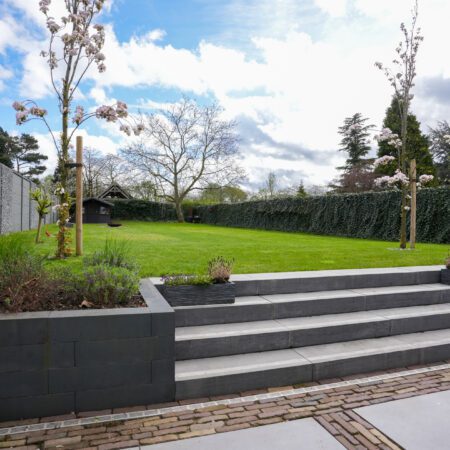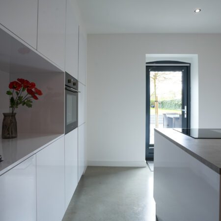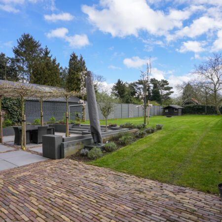 Via een open en met authentieke eiken wagonplanken omlijste doorgang in de authentieke, volsteens gemetselde scheidingswand (als voormalige buitengevel in de achterwand van de living) kom je in een heerlijk ruime en lichte leefkeuken van ca. 7.55 x 4.00 m. Deze beschikt over dezelfde vloerafwerking als in de living en is voorzien van een moderne greeploze inbouwkeuken bestaande uit een spoel- en kookeiland met een komposiet werkblad en inbouwapparatuur (Quooker, inductiekookplaat met downdraft afzuiging en een vaatwasser). Daarnaast is er een ca. 4.00 m brede kastenwand met inbouwoven en -koelkast. Vanuit de leefkeuken is er door middel van 2 loopdeuren direct contact met buiten. Je komt dan uit op een fraai aangelegd en ruim bemeten terras met een hoogwaardige plavuizen vloer, doordacht gekozen beplanting en inclusief stroom- en watervoorziening. Aansluitend aan het terras bevindt zich een niveau hoger een riante, onderhoudsvriendelijke achtertuin (diepte tot aan de achtergevel ca. 41 m), gelegen op het Zuiden en met rondom erfafscheidingen voor optimale privacy, een praktisch vrijstaand houten tuinhuis en op 2 plekken in de achtertuin reeds aangelegde aansluitpunten voor stroom en water.