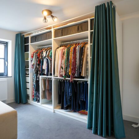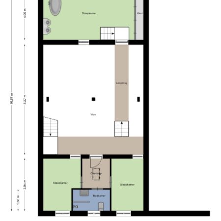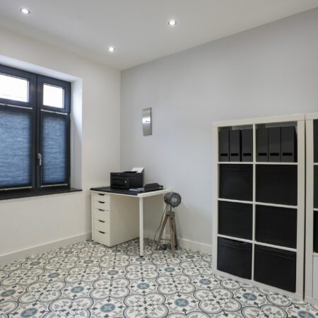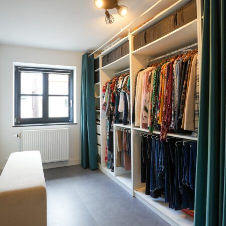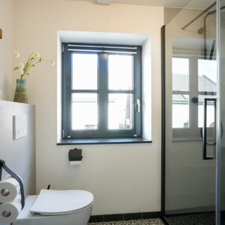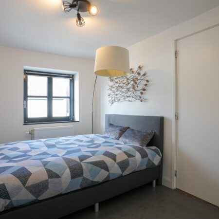 In de living is een open stalen trap geplaatst voor de toegang naar de verdieping. We lopen eerst naar de voorste sectie van de verdieping. Via een antraciet deur met glaspanelen komen we op de overloop. Van daaruit zijn 2 slaapkamers en 1 badkamer te bereiken. De badkamer (met raam) van ca. 2.80 x 1.60 m beschikt over glad gestucte wandafwerking, decor vloertegels, een wastafelmeubel, wandcloset, inloopdouche en een handdoekradiator. De beide slaapkamers van respectievelijk ca. 3.95 x 2.40 m en 3.95 x 2.80/2.10 m hebben niet alleen een raam aan de gevelzijde, maar ook een raam aan de binnenzijde met zicht op de living! Op dit moment is 1 slaapkamer ingericht als dressingroom. De verdieping aan deze zijde is uitgevoerd als betonvloer met moderne pvc vloerbedekking.