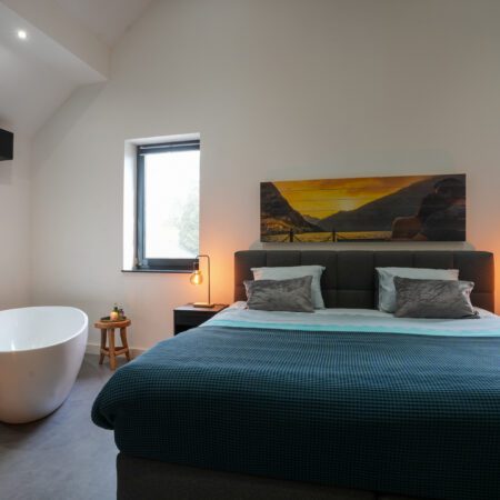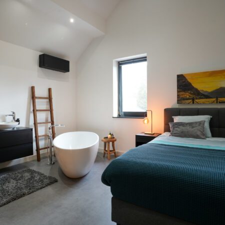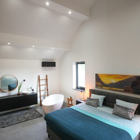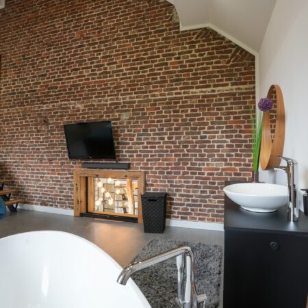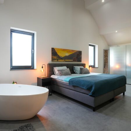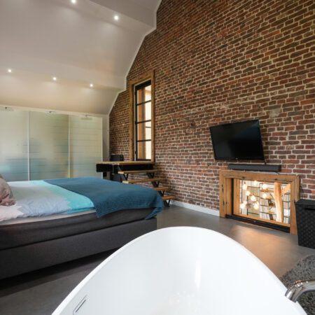 We verlaten deze voorste sectie en lopen over de ca. 8.30 m lange loopbrug, op ca. 4.00 m hoogte boven de living, naar het achterste deel van de verdieping. Hier bevindt zich een prachtige master bedroom van ca. 7.55 x 4.00 m met een moderne pvc vloerbedekking op een houten vloerconstructie. Deze ruimte voelt geweldig, mede door de enorme hoogte (het dak is het plafond) en de fraaie afwerking met een combinatie van deels nog de authentieke, volsteens gemetselde buitenmuur en deels modern glad stucwerk. In deze ruimte, voorzien van airconditioning bevindt zich een open badkamergedeelte met een groot wastafelmeubel en een losstaand xxl bad waarin je na een dag hard werken heerlijk kunt ontspannen! Ook hier is een inpandig raam geplaatst met zicht op de living.