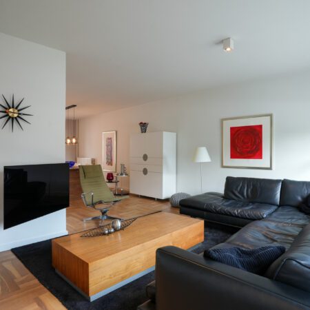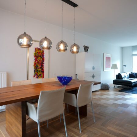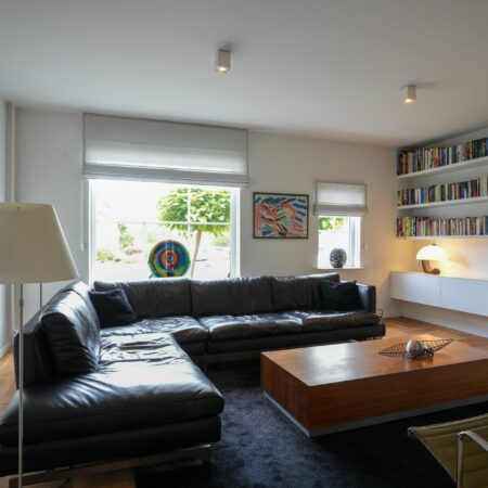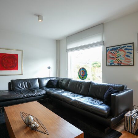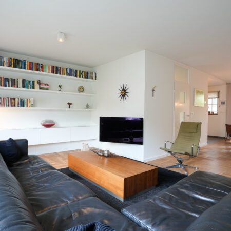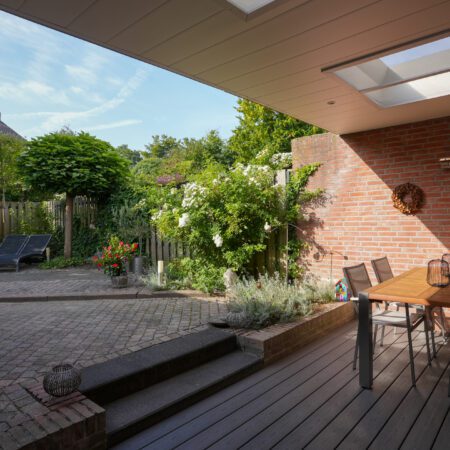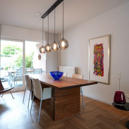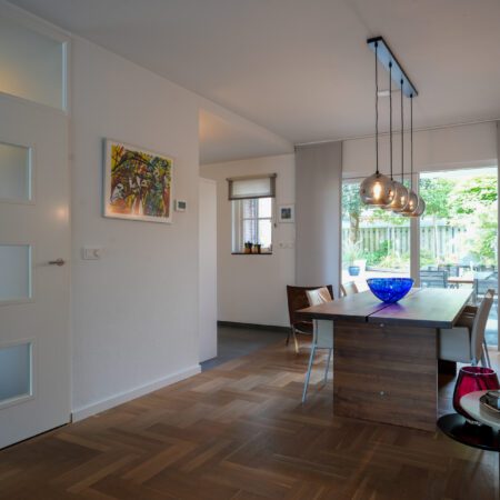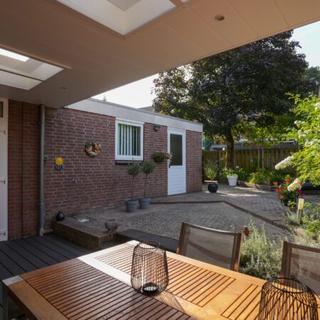 Vanuit de hal loop je de woonkamer binnen. Samen met de eetkamer en de in 1996 gerealiseerde uitbouw van de keuken beschik je over een heerlijke leefruimte van in totaal ca. 54 m2! De woonkamer bevindt zich aan de voorzijde van de woning en is (net als de eetkamer) voorzien van een mooie massief eiken parketvloer. We lopen naar achteren en arriveren dan in de eetkamer die in open contact staat met de grote leefkeuken. Door middel van een grote, hardhouten schuifpui is vanuit de eetkamer het knusse overdekte terras (ca. 5.15 x 2.50 m) bereikbaar (uit 2021) met zicht op de mooi aangelegde achtertuin gelegen op het zuiden.