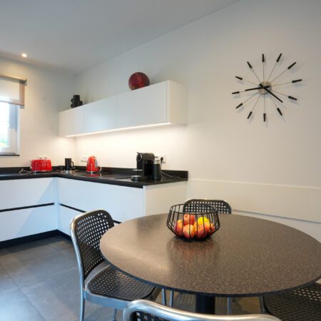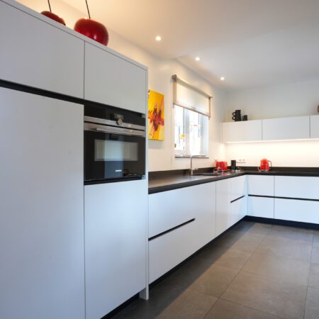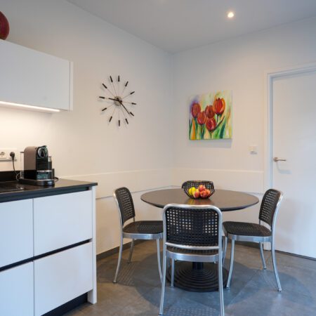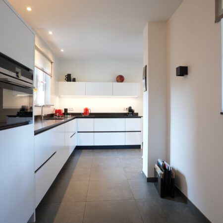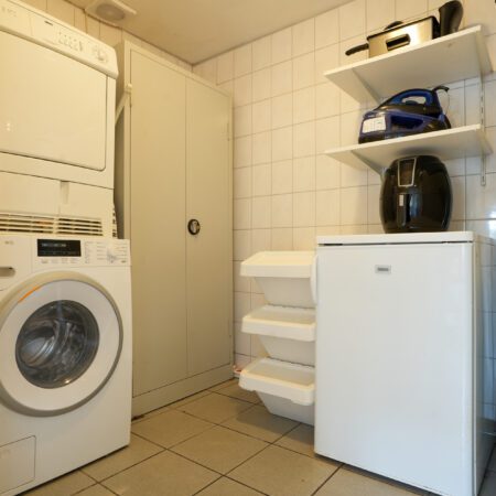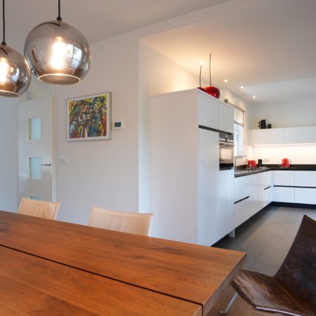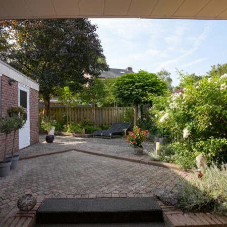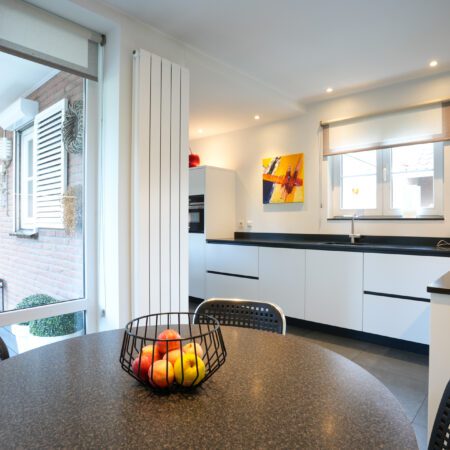 Via de eetkamer loop je door naar de fraaie open keuken die in 2021 grondig onder handen is genomen. De vloer is voorzien van moderne 60x60cm plavuizen met elektrische vloerverwarming. Verder is er een grote, luxe keukeninstallatie geplaatst met greeploze panelen, een groot hardstenen werkblad, spoelbak, inductiekookplaat met downdraft afzuiging, oven/magnetroncombinatie, koelkast, vaatwasser en een sierradiator. In de keuken is voldoende vloeroppervlakte aanwezig voor het inrichten van een ontbijtruimte. Vanuit de keuken kun je d.m.v. een loopdeur naar buiten en kom je uit op het overdekte terras. Direct grenzend aan de keuken is voorts nog een praktische en geheel betegelde bijkeuken gesitueerd waar de witgoedaansluitingen zijn geplaatst. Hierachter en via de tuin d.m.v. een loopdeur bereikbaar bevindt zich een kleine garage annex berging van ca. 3.65 x 3.00 m, voorzien van een kantelpoort uitkomend op de aan de achtertuin grenzende verkeersluwe straat. Ook via een houten poort in de achtertuin is deze straat bereikbaar.
