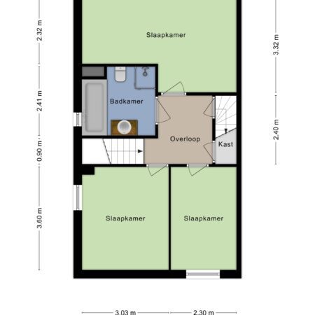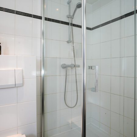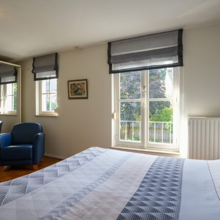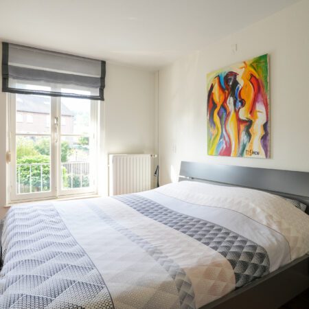 Vanuit de ontvangsthal lopen we de trap op naar de verdieping en komen we uit op een ruime overloop die toegang geeft tot 3 slaapkamers, de badkamer en een praktische bergkast onder de trap naar de tweede verdieping. De geheel betegelde badkamer van ca. 2.50 x 2.40 m is in 2006 vernieuwd waarbij in 2018 er een nieuwe tegelvloer is geplaatst. De badkamer is voorzien van een wastafelmeubel, een ligbad, douche, wandcloset, een plafond met spots en een vast gevelraam. De eerste slaapkamer van ca. 15,5 m2 is gelegen aan de achterzijde van de woning en is voorzien van een Frans balkon, hardhouten kozijnen met enkel glas en rolluiken. De tweede slaapkamer van ca. 11 m2 ligt aan de zijgevel van de woning en beschikt over een kunststof kozijn met dubbele beglazing. De derde slaapkamer van ca. 8,5 m2 is gelegen aan de voorzijde van de woning en is eveneens voorzien van een Frans balkon en kunststof kozijnen met dubbele beglazing. Op de gehele verdieping (m.u.v. de badkamer) ligt een in goede staat verkerende eiken mozaïek parketvloer.