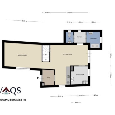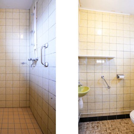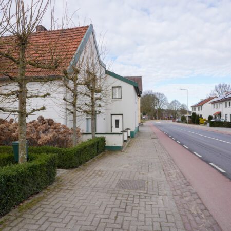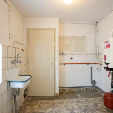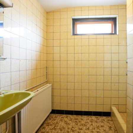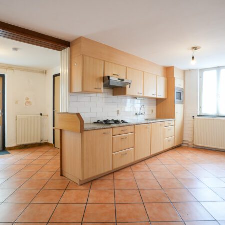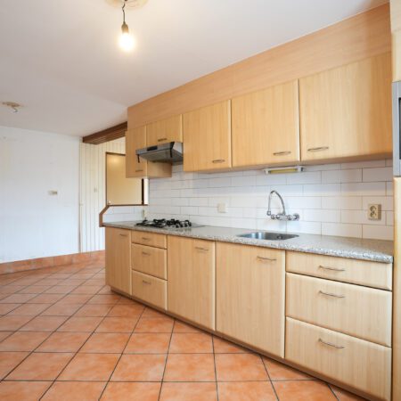 De L-vormige ruime woonkeuken van ca. 23 m2 heeft een tegelvloer op een betonnen constructievloer. Via de rechts van de woning gelegen tuin met oprit is er een achterom met een loopdeur naar de woonkeuken.. De huidige keukeninstallatie is geplaatst aan de voorzijde van de woning vlakbij een raam met uitzicht op straat. Vanuit de keuken heb je toegang naar een handige bijkeuken van ca. 2.50 x 2.40 m met tegelvloer, raam en witgoedaansluitingen. Hier bevindt zich ook de gasmeter en de cv-combiketel (Remeha Tzerra Ace 28 (CW4), bouwjaar 2019 en gehuurd van Volta. Aan de andere zijde van de keuken loop je via een klein portaal naar de toiletruimte van ca. 1.55 x 1.10 m en de badkamer van ca. 4 m2 met wastafel en douche. De achter- c.q. zijtuin van in totaal ca. 46 m2 bevindt zich aan de rechterzijde van de woning, is gelegen op het zuiden, biedt veel privacy en legio mogelijkheden om het er supergezellig te maken.
