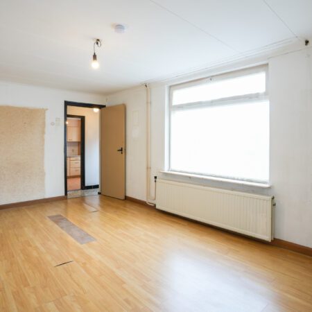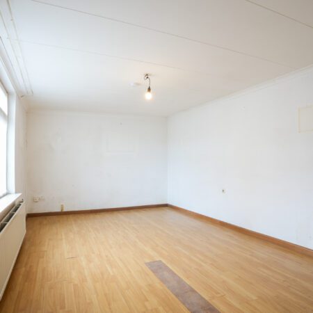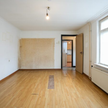 De woonkamer van ca. 5.30 x 3.40 m beschikt over een houten constructievloer, een groot raam met uitzicht op het voortuintje en de doorgaande weg met hier een 50km/u zone.