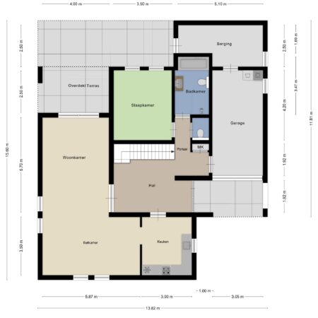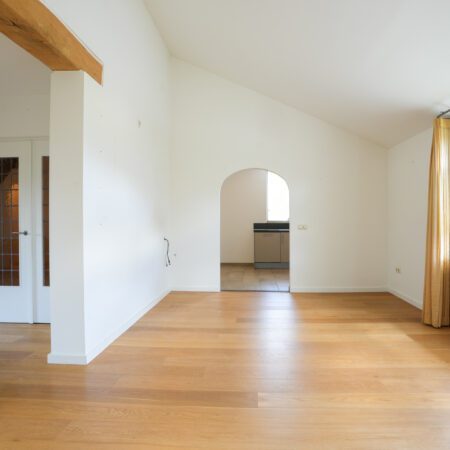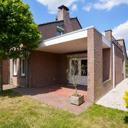Als u gearriveerd bent, lopen we samen via de ruime oprit met een lengte van ca. 10 m naar de overdekte entree. We gaan naar binnen en betreden de hal die met een afmeting van ca. 5.00 x 4.05 m. met recht een ontvangsthal genoemd mag worden. Chique afgewerkt met glad stucwerk wanden en een beige marmer plavuizen vloer. De hal geeft toegang tot enerzijds de keuken en de woonkamer en anderzijds via een portaal toegang tot een slaapkamer, de badkamer, het gastentoilet en de inpandige garage. Ook bevindt zich in de hal een gemoderniseerde meterkast met 13 groepen (schakelautomaten), 2 aardlekschakelaars, een aansluiting voor gebruik van glasvezel internet, alsmede vanuit de hal een open trap naar de verdieping. Via dubbele openslaande deuren lopen we de woonkamer binnen. Samen met de eetkamer hebben we het dan over een comfortabele oppervlakte van ca. 45 m2! Beide ruimtes zijn eveneens afgewerkt met glad stucwerk wandafwerking en een eiken plankenvloer. Veel ramen zorgen voor een aangename lichtinval. Bovendien heeft de woonkamer openslaande tuindeuren naar een heerlijk overdekt en in het woningontwerp geïntegreerd terras van ca. 4.00 x 2.80 m. voorzien van een plafond met spots. De woonkamer heeft een open doorgang naar de eetkamer en de overgang wordt gemarkeerd door een prachtige eikenhouten balk in het plafond. We staan nu in de eetkamer en wat meteen opvalt is de fijne ruimtelijke beleving door de extra hoogte. Het plafond wordt immers gevormd door het afgewerkte dakbeschot! Via een halfopen doorgang, die eenvoudig breder gemaakt kan worden door de niet dragende wand komen we in de keuken van ca. 3.50 x 3.00 m. Hier is in 2014 zowel de wandafwerking (glad stucwerk) als de vloer (groot formaat tegels) en de inbouwkeuken vernieuwd. De keukeninstallatie (Brugman) is geplaatst in een hoekopstelling en omvat een 1,5 spoelbak en is verder geheel voorzien van AEG inbouwapparatuur (4-pits inductiekookplaat, rvs 90cm afzuigkap, combimagnetron/oven, vaatwasser en koelkast). Vanuit de keuken lopen we weer naar de ontvangsthal om vandaar uit via het aansluitende portaal naar het slaapverblijf op de begane grond te gaan. De slaapkamer aldaar van ca. 4.20 x 3.50 m is gelegen aan de achterzijde van de woning en is voorzien van rolluiken. Ook hier glad stucwerk wandafwerking en een laminaat vloerbedekking. Via het portaal is ook bereikbaar het gastentoilet, de badkamer en de inpandige garage. Het luxe toilet is in 2014 gerenoveerd, geheel modern betegeld en voorzien van een wandcloset en een fonteintje. Voor de badkamer van ca. 7 m2 geldt hetzelfde. Geheel modern betegeld en voorzien van een wastafelmeubel, een wandcloset, een ruime inloopdouche, een ligbad, een handdoekradiator en een plafond met spots. Dan lopen we via het portaal naar de inpandige garage van ca. 6.35 x 3.05 m. met tegelvoer. Ruim genoeg om indien gewenst je auto te parkeren en nog ruimte over te houden voor het hier plaatsen van je wasmachine en droger. Naast deze aansluitingen bevindt zich een praktische stortbak met warm en koud water. De garagepoort is een elektrisch (en op afstand) bedienbare moderne sectionaalpoort. We zijn nog niet klaar op de begane grond want via de garage lopen we door naar de royale berging van ca. 11 m2, eveneens voorzien van een tegelvloer en met een loopdeur naar de achtertuin.