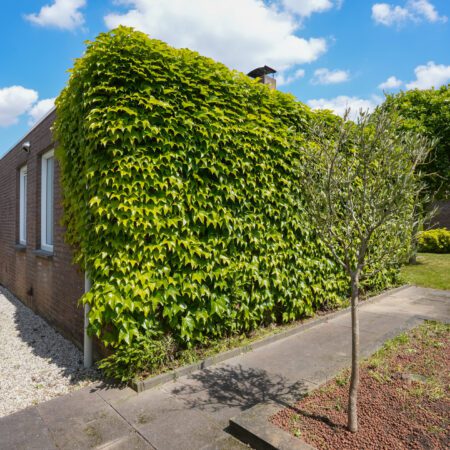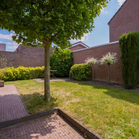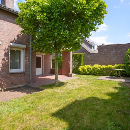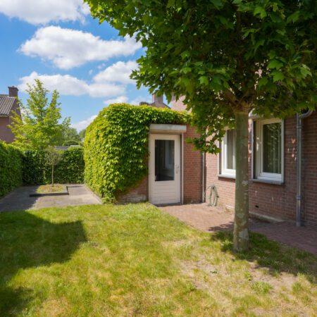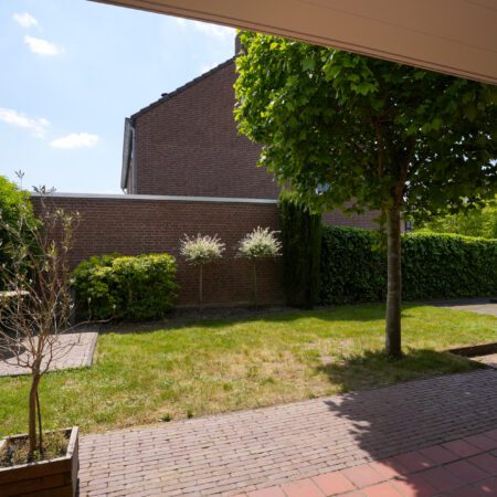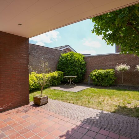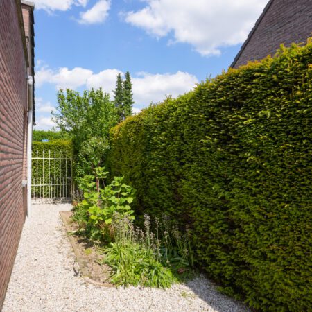 Nu we de woning hebben bekeken, is het tijd voor buiten! Zoals eerder vermeld, kun je via de openslaande tuindeuren vanuit de woonkamer of via de loopdeur in de berging achter de garage naar buiten. Het gaat hier om een echt vrijstaand huis dus heb je rondom tuin. Een verzorgde tuin met een fijne bezonning (in de ochtend de zon op je overdekte terras en om 12:00 uur heb je de zon vol op je achtertuin). Langs de garage is een plek gecreëerd om de afvalcontainers netjes uit het zicht te plaatsen. Aan de andere kant van de tuin is er een doorgang naar de voorzijde van het huis, afgesloten met een sierhek. Waar je ook bent in de tuin, door de verzorgde beplanting en hagen is de privacy hier optimaal!