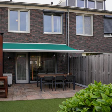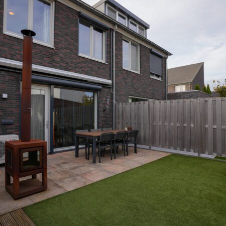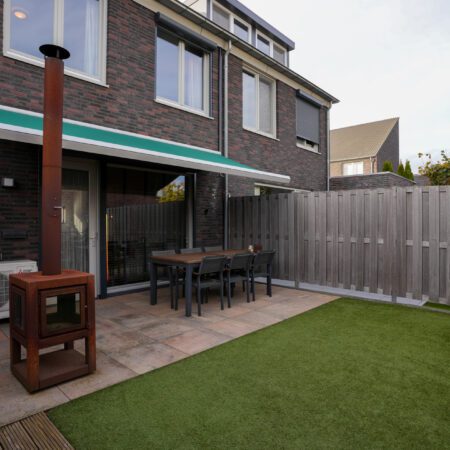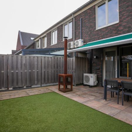 In de hal bevindt zich een moderne meterkast, een luxe gastentoilet (betegeld met groot formaat wandtegels en voorzien van een hangcloset en een fonteintje) en een gesloten trap naar de verdieping. Vanuit de hal loop je de living binnen. Deze is verdeeld in een woonkamer met een open keuken en beslaat in totaal ca. 35 m2. Een heerlijk comfortabele ruimte met veel lichtinval, vloerverwarming en airconditioning. We lopen eerst naar de open keuken. Deze is voorzien van een moderne inbouwkeuken in hoekopstelling, uitgerust met alle hedendaagse inbouwapparatuur (5-pits gaskookplaat, 90cm brede afzuigkap, oven-/magnetroncombinatie, koelkast en vaatwasser). We draaien ons om en lopen naar de woonkamer. Voorzien van een strakke, antraciet grindvloer die we verder in de woning ook tegenkomen. In de woonkamer bevindt zich een praktische bergkast onder de trap. Via een loopdeur in de achtergevel lopen we naar buiten en komen dan in een verzorgde, onderhoudsvrije achtertuin. Voorzien van een mooi aangelegd terras met grote plavuizen en een elektrisch bedienbare grote zonwering. Een hele fijne plek om na een drukke werkdag (en mooi weer) te ontspannen of in het weekend het gezellig te hebben met vrienden of familie. Aansluitend aan het terras is er kunstgras aangelegd en bevindt zich in de achtertuin nog een praktische tuinberging. En last but not least, je kunt hier dus via de achtertuin naar de voorzijde van de woning!