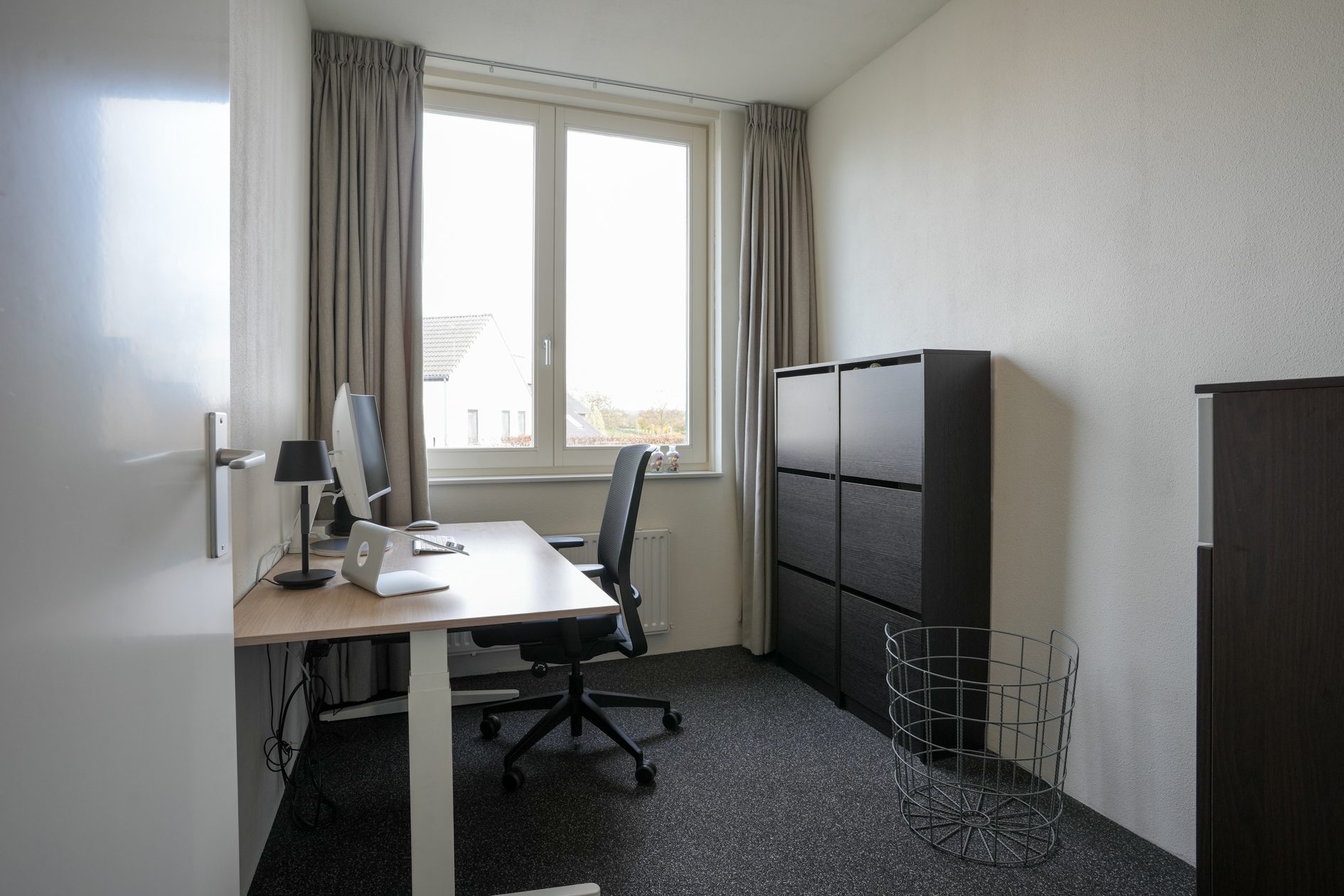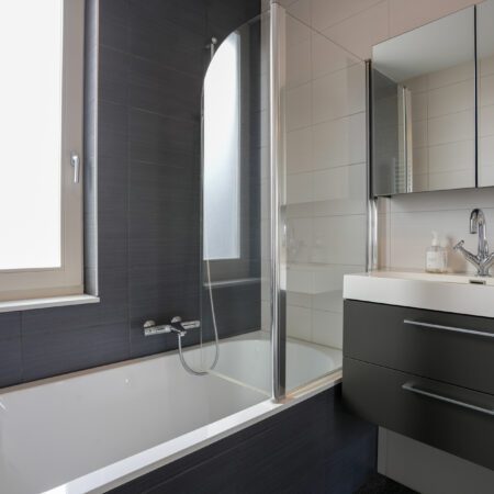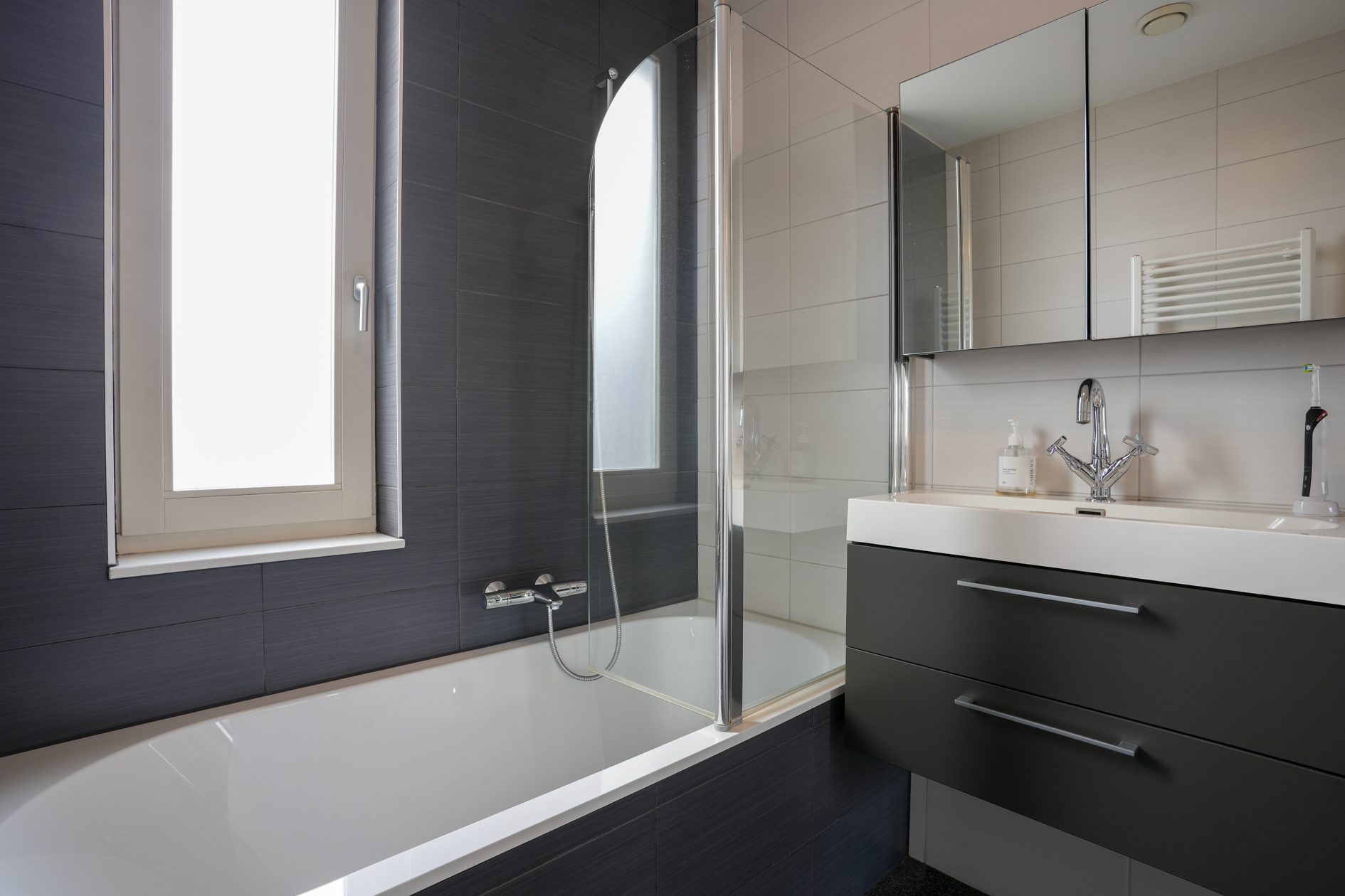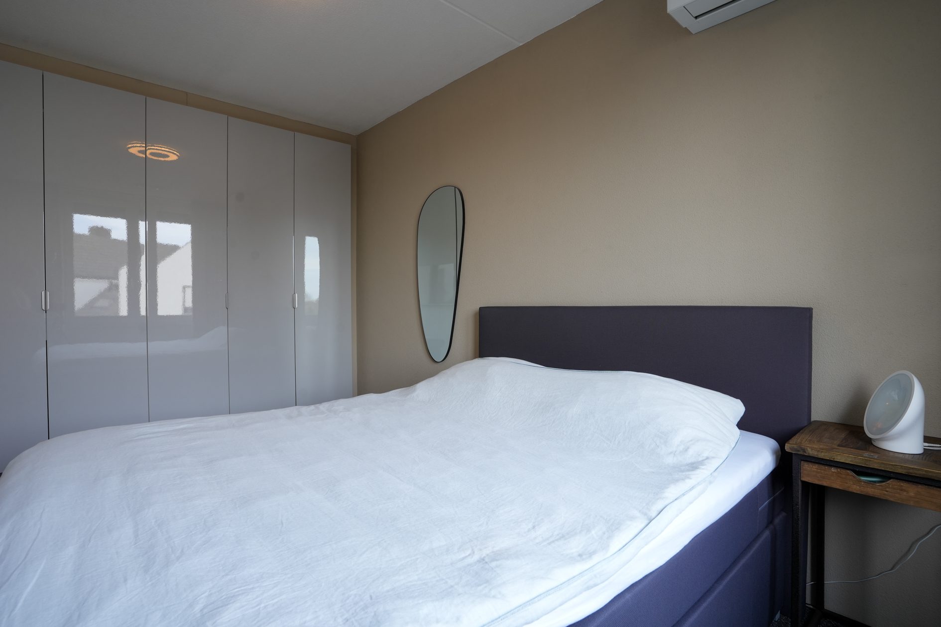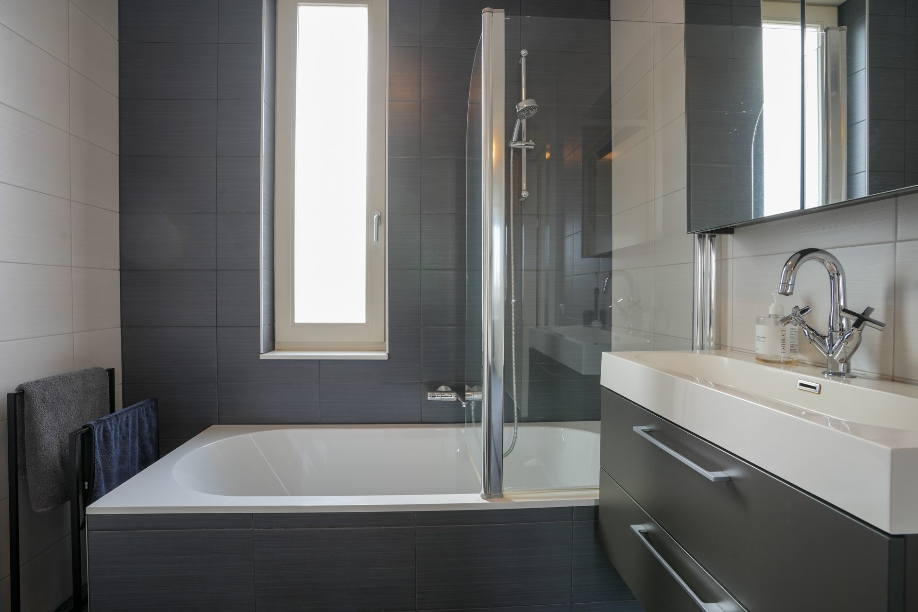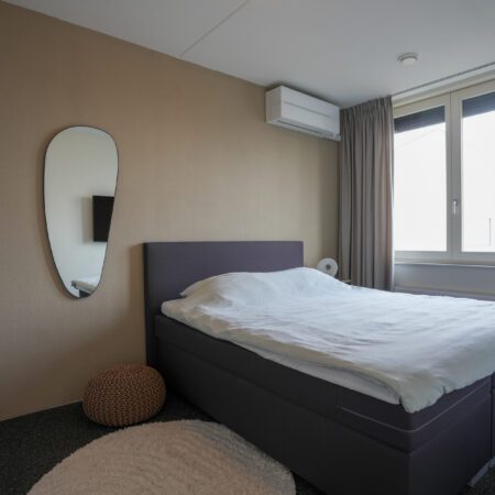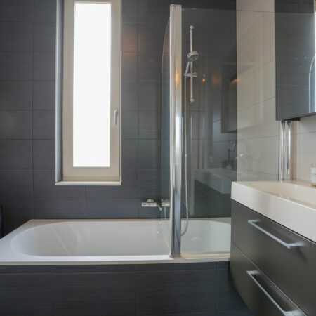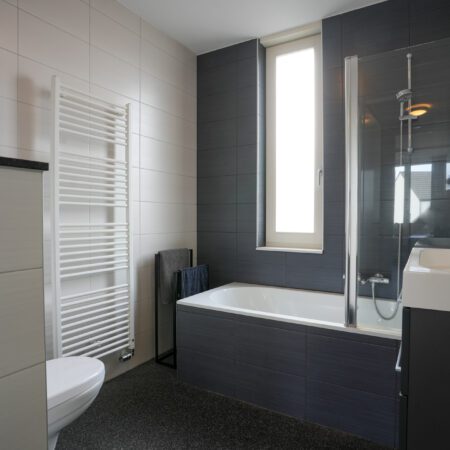 We lopen terug naar binnen en gaan via de hal naar boven. Daar kom je uit op de overloop die toegang geeft tot de 3 slaapkamers en de badkamer. Laten we beginnen in de luxe badkamer van ca. 5,5 m2. Deze is voorzien van vloerverwarming, een wastafelmeubel, ligbad/douchecombinatie, wandcloset, een handdoekradiator en een gevelraam voor natuurlijk daglicht wat altijd fijn is in een badkamer. Na dit te hebben bewonderd loop je naar de slaapkamer van ca. 4.00 x 2.70 m aan de voorzijde van de woning. Strak afgewerkt en voorzien van airco en een elektrisch bedienbaar rolluik! Dan naar de slaapkamers aan de achterzijde. De tweede slaapkamer van ca. 4.75 x 2.70 m beschikt eveneens over een airco en een elektrisch bedienbaar rolluik. Daarnaast heeft deze slaapkamer ook een hele mooie inbouw kastenwand die aangeboden wordt ter overname. Tot slot de derde slaapkamer van ca. 3.05 x 2.20 m die door de huidige eigenaren in gebruik is als werkkamer.