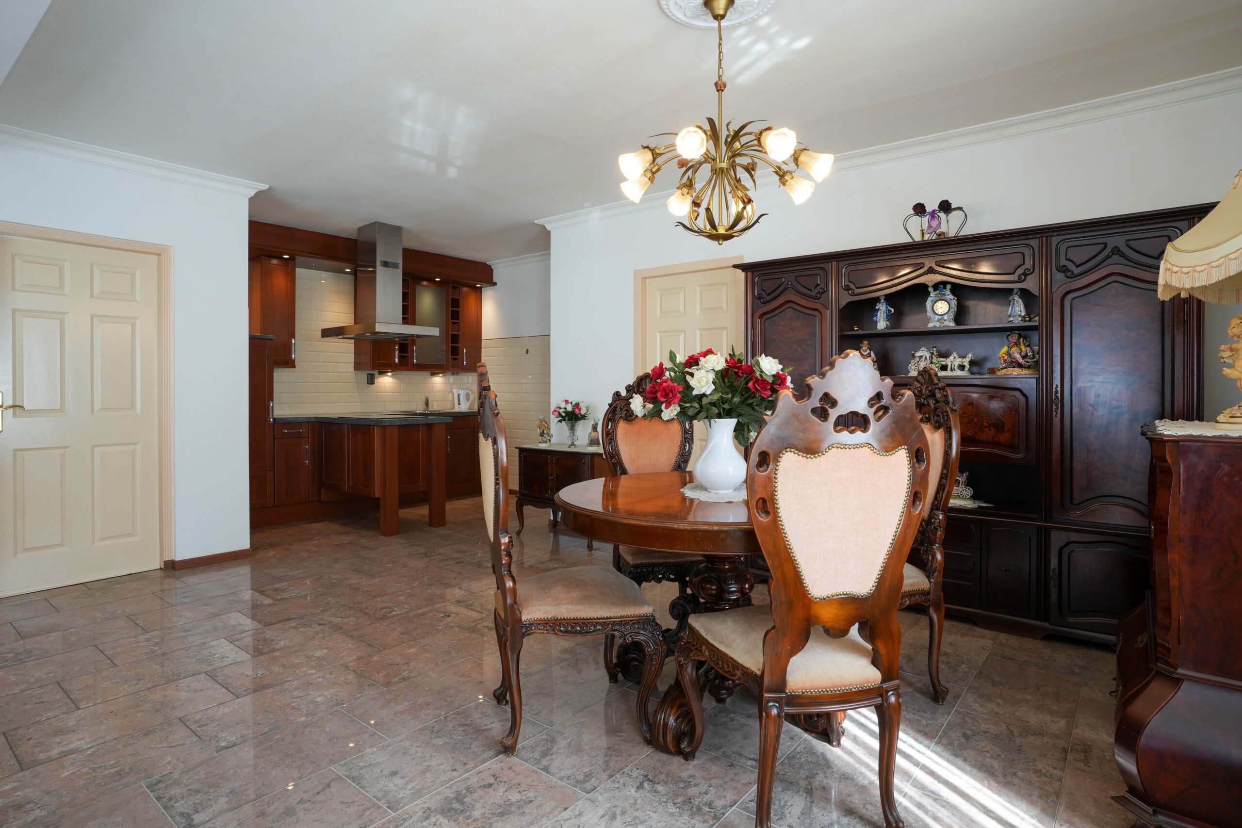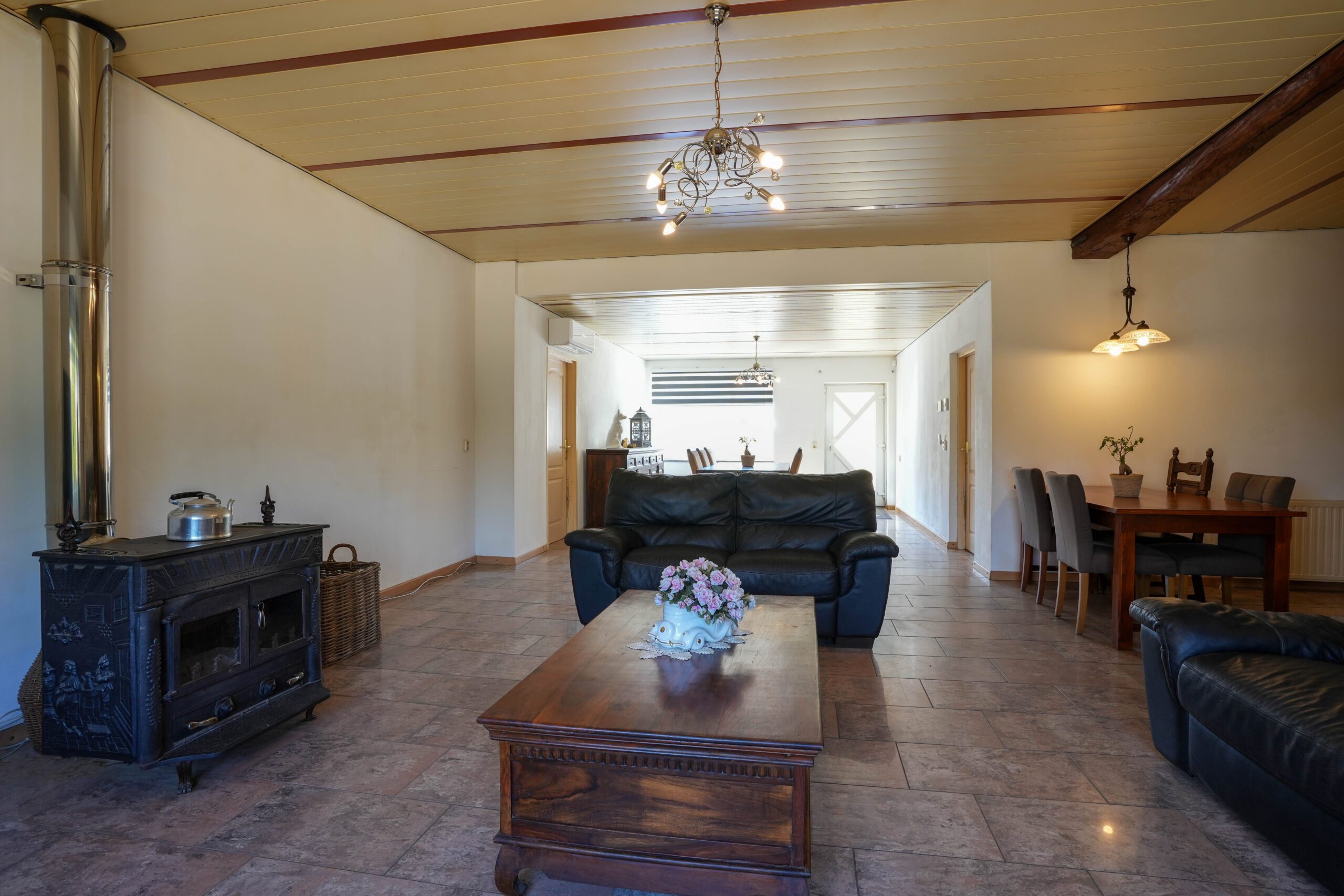 Via de grote hal van de voorbouw of rechtstreeks via de buitendeur naar de eetkamer kom je het tussengelegen woongedeelte binnen. Wij lopen via de eetkamer naar binnen en komen dan in een riante ruimte van ca. 62 m2 waarin de eetkamer, de woonkamer en de open keuken zijn gesitueerd. De gehele ruimte is voorzien van een luxe vloerafwerking met marmeren plavuizen. De woonkamer is voorzien van een hoogwaardige houtkachel en een airco-installatie. De open keuken beschikt over een inbouwkeuken in L-opstelling met inbouwapparatuur (inductiekookplaat, vlakscherm afzuigkap, oven, koelkast en vaatwasser). Naast de woonkamer bevindt zich de geheel betegelde badkamer van ca. 3.00 x 3.25 m, voorzien van een wastafelmeubel, een inloopdouche en een wandcloset.
