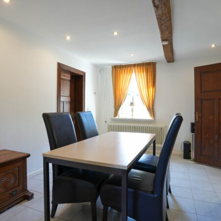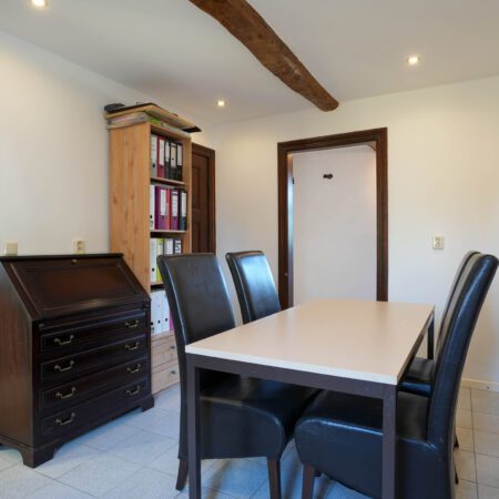 Via de eetkamer loop je naar de slaapkamer van ca. 4.90 x 3.55 m. Van daaruit is de was- annex cv-ruimte van ca. 4.90 x 1.95 m te bereiken. Hier bevinden zich de witgoedaansluitingen en de uitgebreide meterkast (voor de gehele woning) inclusief krachtstroom, alsmede de cv-ketels voor de voorbouw (Nefit Excellent HR combiketel uit ca. 2000, eigendom) en het tussengelegen woongedeelte (Remeha Avanta HR combiketel uit ca. 2020, eigendom). De wasruimte staat weer in verbinding met de grote hal van het woongedeelte aan de voorzijde.